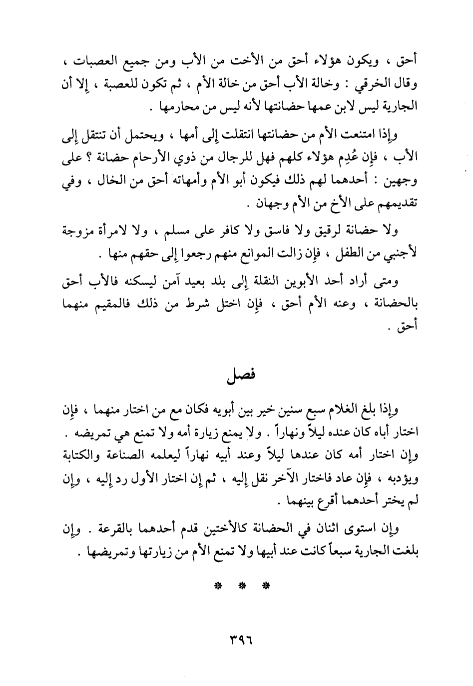 وإِذا بلغ الغلام سبع سنين خير بين أبويه فكان مع من اختار منهما، فإِن اختار أباه كان عنده ليلاً ونهاراً. ولا يمنع زيارة أمه ولا تمنع هي تمريضه. وإِن اختار أمه كان عندها ليلاً وعند أبيه نهاراً ليعلمه الصناعة والكتابة ويؤدبه، فإِن عاد فاختار الآخر نقل إِليه، ثم إِن اختار الأول رد إِليه، وإِن لم يختر أحدهما أقرع بينهما.