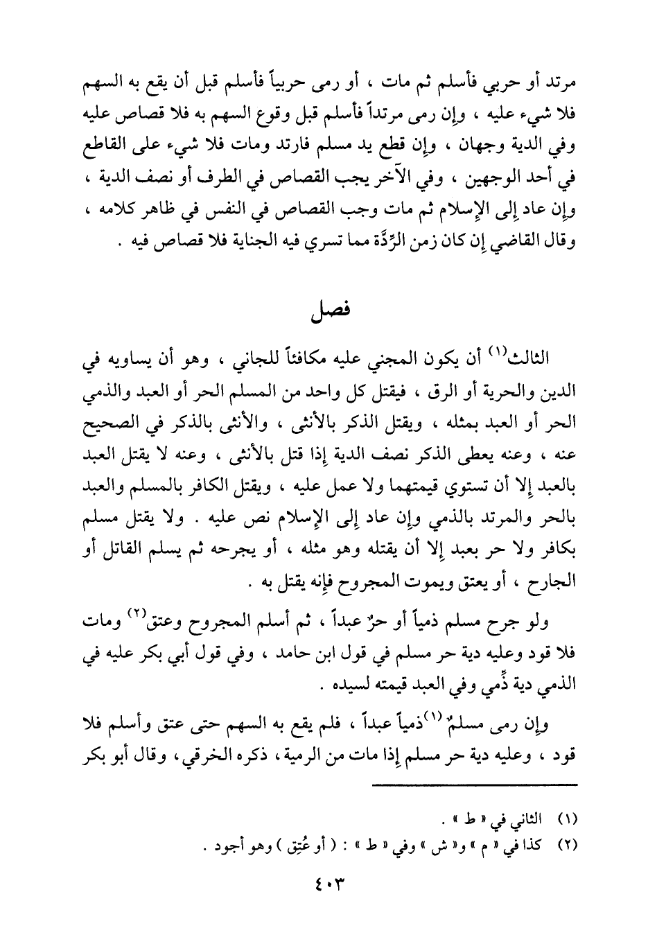 مرتد أو حربي فأسلم ثم مات، أو رمى حربياً فأسلم قبل أن يقع به السهم فلا شيء عليه، وإِن رمى مرتداً فأسلم قبل وقوع السهم به فلا قصاص عليه وفي الدية وجهان، وإِن قطع يد مسلم فارتد ومات فلا شيء على القاطع في أحد الوجهين، وفي الآخر يجب القصاص في الطرف أو نصف الدية، وإِن عاد إِلى الإِسلام ثم مات وجب القصاص في النفس في ظاهر كلامه، وقال القاضي إِن كان زمن الرِّدَّة مما تسري فيه الجناية فلا قصاص فيه.