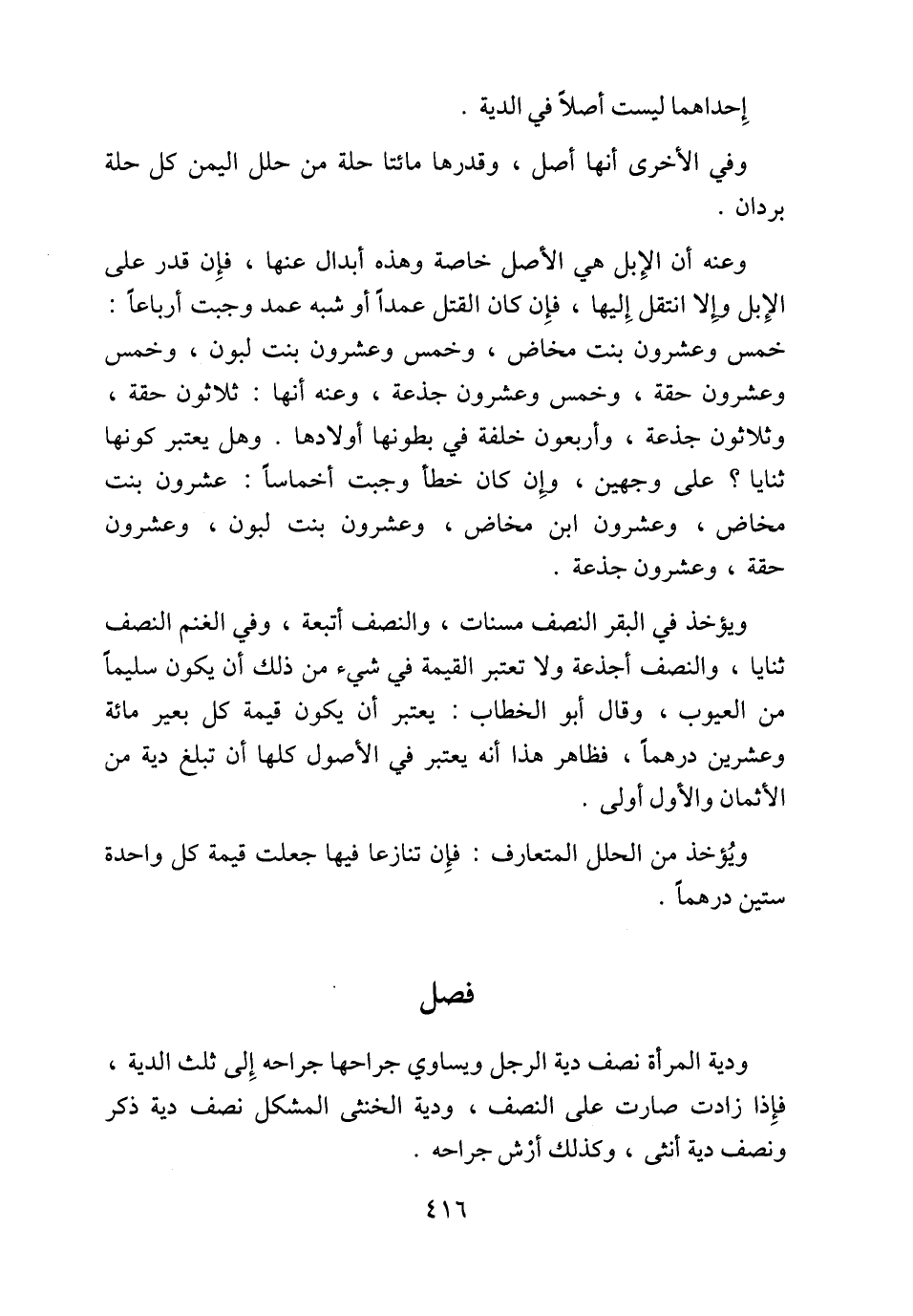 ودية المرأة نصف دية الرجل ويساوي جراحها جراحه إِلى ثلث الدية، فإِذا زادت صارت على النصف، ودية الخنثى المشكل نصف دية ذكر ونصف دية أنثى، وكذلك أرْش جراحه.