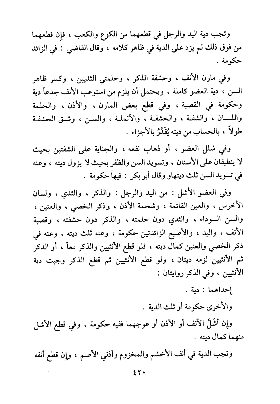 وفي العضو الأشل: من اليد والرجل: والذكر، والثدي، ولسان الأخرس، والعين القائمة، وشحمة الأذن، وذكر الخصي، والعنين، والسن السوداء، والثدي دون حلمته، والذكر دون حشفته، وقصبة الأنف، واليد، والأصبع الزائدتين حكومة، وعنه ثلث ديته، وعنه في ذكر الخصي والعنين كمال ديته، فلو قطع الأنثيين والذكر معاً، أو الذكر ثم الأنثيين لزمه ديتان، ولو قطع الأنثيين ثم قطع الذكر وجبت دية الأنثيين، وفي الذكر روايتان: