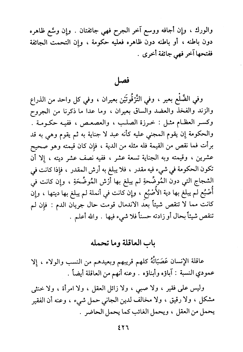 وفي الضَّلْع بعير، وفي التَّرقُوتَيْن بعيران، وفي كل واحد من الذراع والزند والفخذ والعضد والساق بعيران، وما عدا ما ذكرنا من الجروح وكسر العظام مثل: خرزة الصلب، والعصعص، ففيه حكومة. والحكومة إِن يقوم المجني عليه كأنه عبد لا جناية به ثم يقوم وهي به قد برأت فما نقص من القيمة فله مثله من الدية، فإِن كان قيمته وهو صحيح عشرين، وقيمته وبه الجناية تسعة عشر، ففيه نصف عشر ديته، إِلا أن تكون الحكومة في شيء فيه مقدر، فلا يبلغ به أرش المقدر، فإِذا كانت في الشجاج التي دون المُوضِّحةِ لم يبلغ بها أرْش المُوضِّحَةِ، وإِن كانت في أُصْبُع لم يبلغ بها دية الأُصْبُعِ، وإِن كانت في أنملة لم يبلغ بها ديتها، وإِن كانت مما لا تنقص شيئاً بعد الاندمال قومت حال جريان الدم: فإِن لم تنقص شيئاً بحال أو زادته حسناً فلا شيء فيها. والله أعلم.