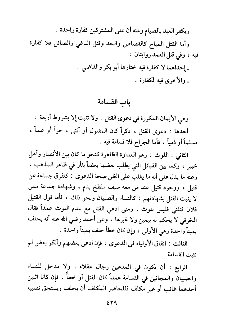 الثاني: اللوث: وهو العداوة الظاهرة كنحو ما كان بين الأنصار وأهل خيبر، وكما بين القبائل التي يطلب بعضها بعضاً بثأر في ظاهر المذهب، وعنه ما يدل على أنه ما يغلب على الظن صحة الدعوى: كتفرق جماعة عن قتيل، ووجود قتيل عند من معه سيف ملطخ بدم، وشهادة جماعة ممن لا يثبت القتل بشهادتهم: كالنساء والصبيان ونحو ذلك، فأما قول القتيل فلان قتلني فليس بلوث. ومتى ادعي القتل مع عدم اللوث عمداً فقال الخرقي لا يحكم له بيمين ولا غيرها، وعن أحمد رضي الله عنه أنه يحلف يميناً واحدة وهي الأولى، وإِن كان خطأ حلف يميناً واحدة.
