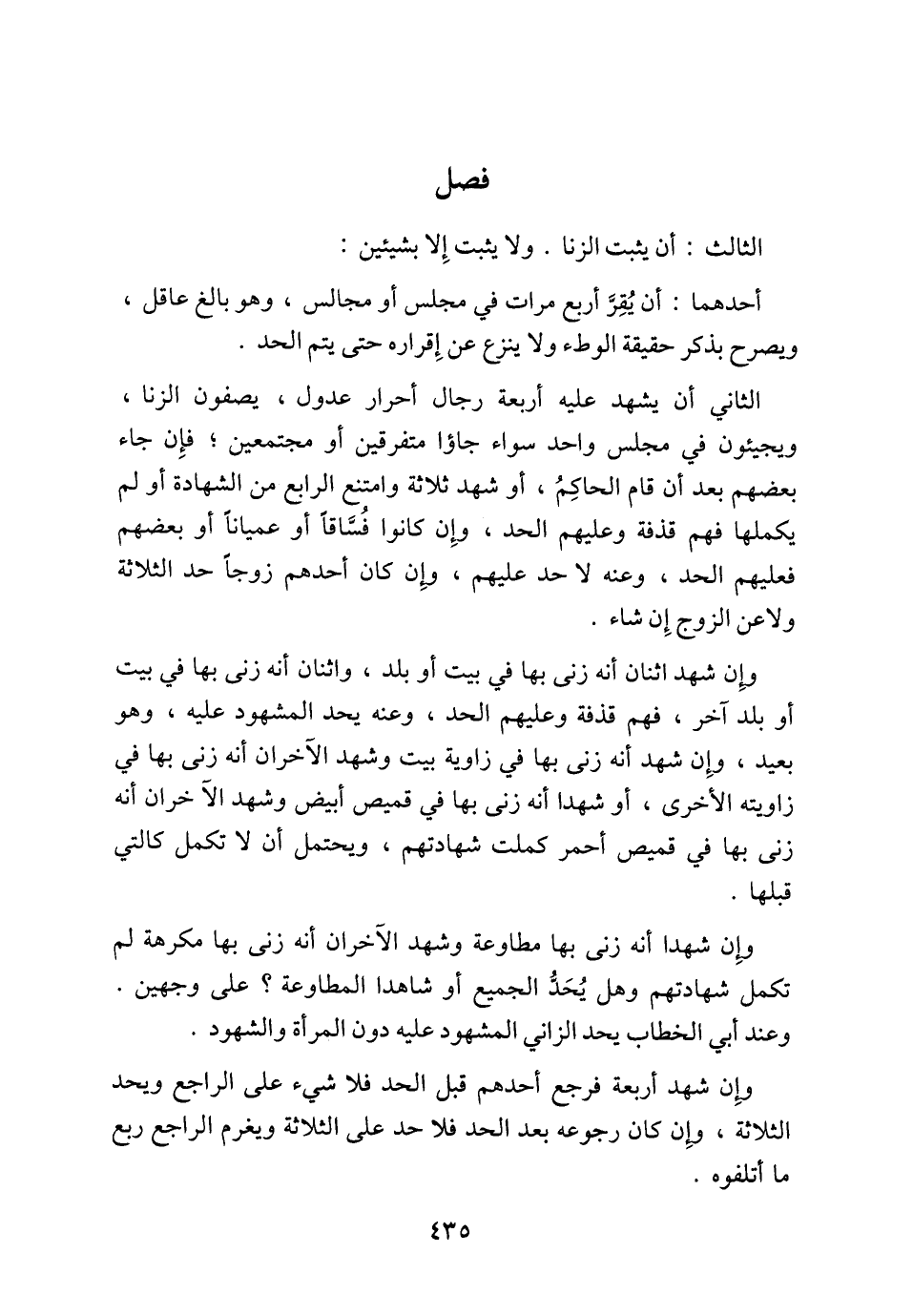 الثاني أن يشهد عليه أربعة رجال أحرار عدول، يصفون الزنا، ويجيئون في مجلس واحد سواء جاؤا متفرقين أو مجتمعين؛ فإِن جاء بعضهم بعد أن قام الحاكِمُ، أو شهد ثلاثة وامتنع الرابع من الشهادة أو لم يكملها فهم قذفة وعليهم الحد، وإِن كانوا فُسَّاقاً أو عمياناً أو بعضهم فعليهم الحد، وعنه لا حد عليهم، وإِن كان أحدهم زوجاً حد الثلاثة ولاعن الزوج إِن شاء.