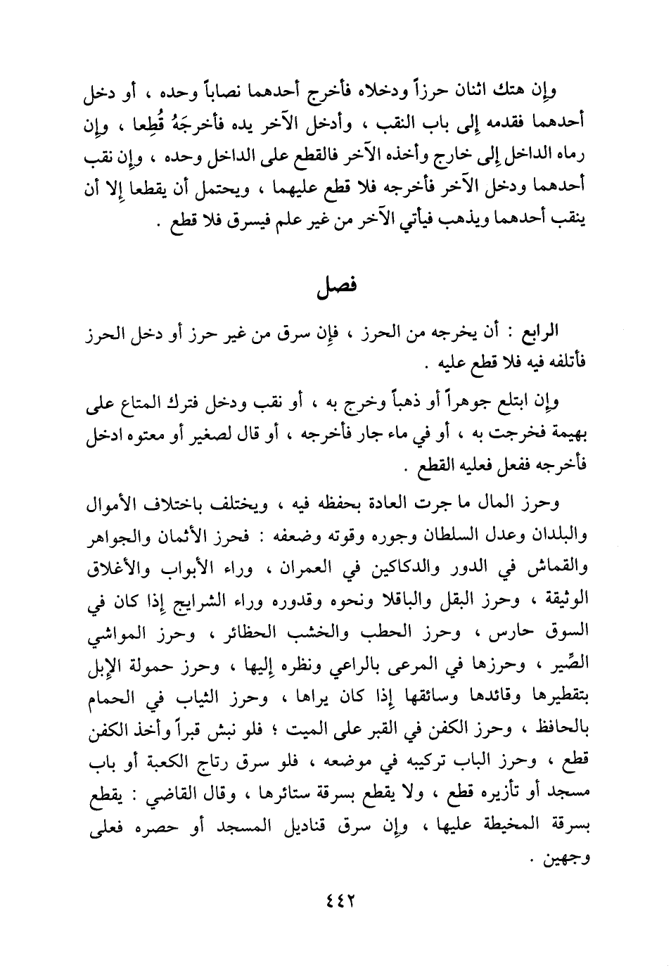 وحرز المال ما جرت العادة بحفظه فيه، ويختلف باختلاف الأموال والبلدان وعدل السلطان وجوره وقوته وضعفه: فحرز الأثمان والجواهر والقماش في الدور والدكاكين في العمران، وراء الأبواب والأغلاق الوثيقة، وحرز البقل والباقلا ونحوه وقدوره وراء الشرايج إِذا كان في السوق حارس، وحرز الحطب والخشب الحظائر، وحرز المواشي الصِّير، وحرزها في المرعى بالراعي ونظره إِليها، وحرز حمولة الإِبل بتقطيرها وقائدها وسائقها إِذا كان يراها، وحرز الثياب في الحمام بالحافظ، وحرز الكفن في القبر على الميت؛ فلو نبش قبراً وأخذ الكفن قطع، وحرز الباب تركيبه في موضعه، فلو سرق رتاج الكعبة أو باب مسجد أو تأزيره قطع، ولا يقطع بسرقة ستائرها، وقال القاضي: يقطع بسرقة المخيطة عليها، وإِن سرق قناديل المسجد أو حصره فعلى وجهين.