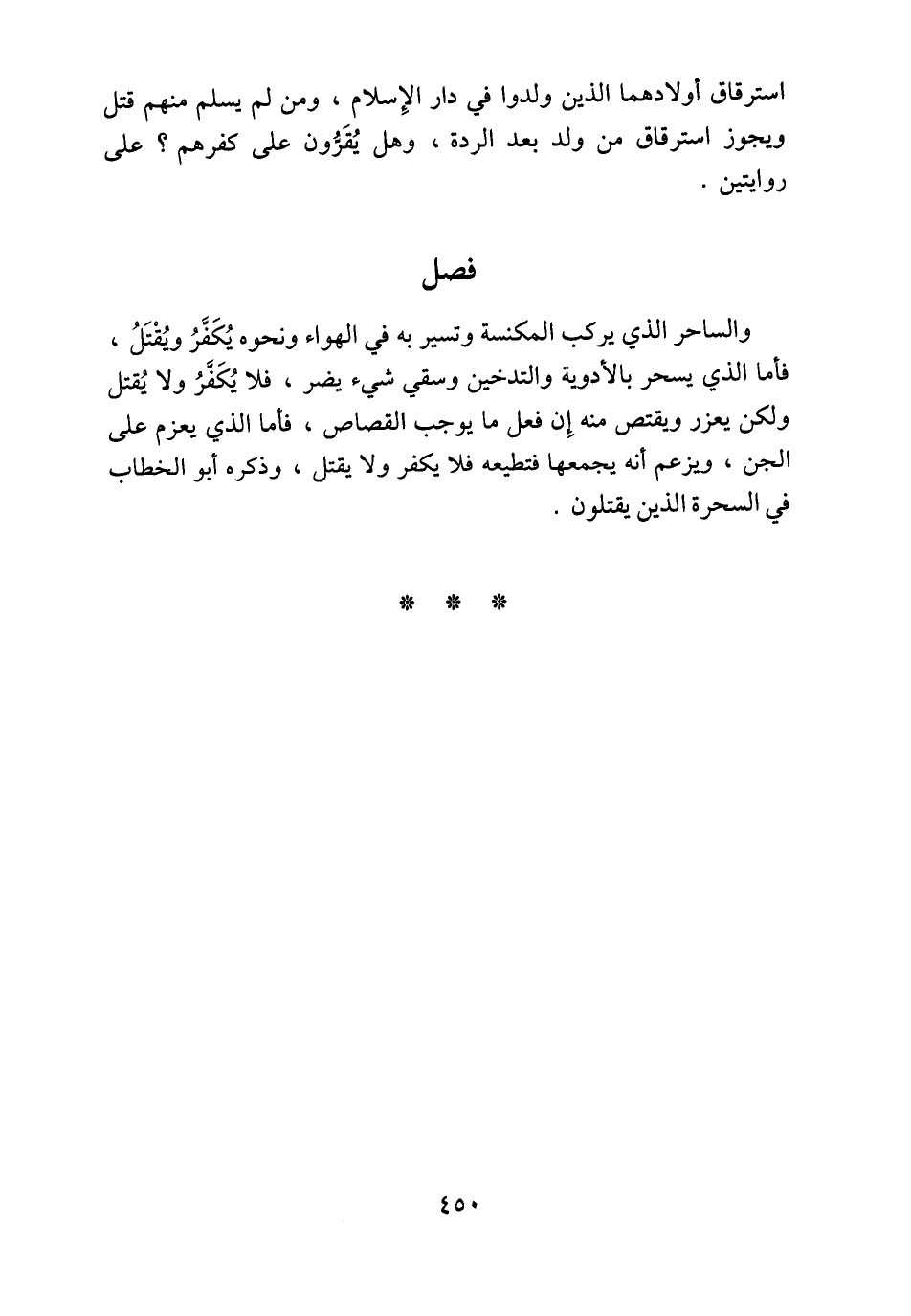 والساحر الذي يركب المكنسة وتسير به في الهواء ونحوه يُكَفَّرُ ويُقْتَلُ، فأما الذي يسحر بالأدوية والتدخين وسقي شيء يضر، فلا يُكَفَّرُ ولا يُقتل ولكن يعزر ويقتص منه إِن فعل ما يوجب القصاص، فأما الذي يعزم على الجن، ويزعم أنه يجمعها فتطيعه فلا يكفر ولا يقتل، وذكره أبو الخطاب في السحرة الذين يقتلون.