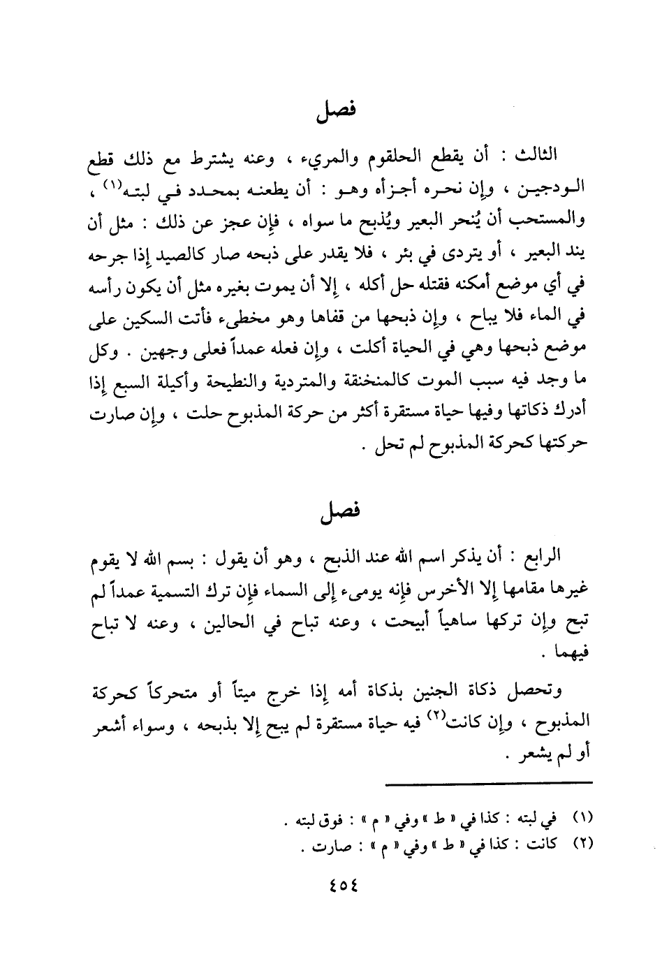 الثالث: أن يقطع الحلقوم والمريء، وعنه يشترط مع ذلك قطع الودجين، وإِن نحره أجزأه وهو: أن يطعنه بمحدد في لبته (¬1)، والمستحب أن يُنحر البعير ويُذبح ما سواه، فإِن عجز عن ذلك: مثل أن يند البعير، أو يتردى في بئر، فلا يقدر على ذبحه صار كالصيد إِذا جرحه في أي موضع أمكنه فقتله حل أكله، إِلا أن يموت بغيره مثل أن يكون رأسه في الماء فلا يباح، وإِن ذبحها من قفاها وهو مخطئ فأتت السكين على موضع ذبحها وهي في الحياة أكلت، وإِن فعله عمداً فعلى وجهين. وكل ما وجد فيه سبب الموت كالمنخنقة والمتردية والنطيحة وأكيلة السبع إِذا أدرك ذكاتها وفيها حياة مستقرة أكثر من حركة المذبوح حلت، وإِن صارت حركتها كحركة المذبوح لم تحل.