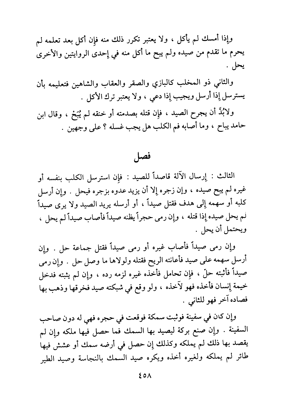 الثالث: إِرسال الآلة قاصدًا للصيد: فإِن استرسل الكلب بنفسه أو غيره لم يبح صيده، وإن زجره إِلا أن يزيد عدوه بزجره فيحل. وإِن أرسل كلبه أو سهمه إِلى هدف فقتل صيداً، أو أرسله يريد الصيد ولا يرى صيداً لم يحل صيده إِذا قتله، وإِن رمى حجراً يظنه صيداً فأصاب صيداً لم يحل، ويحتمل أن يحل.