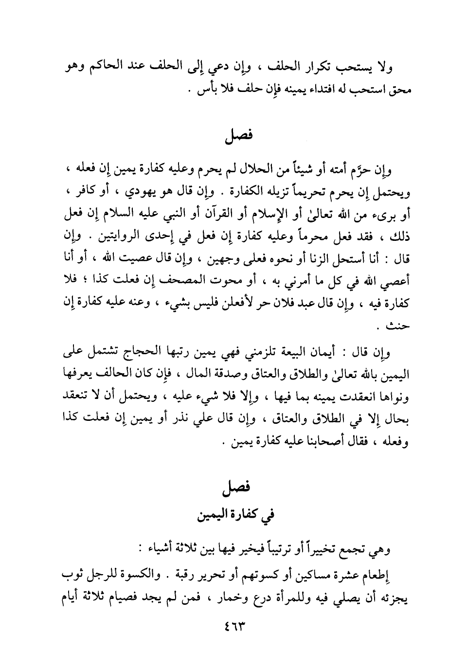 وإِن حرَّم أمته أو شيئاً من الحلال لم يحرم وعليه كفارة يمين إِن فعله، ويحتمل إِن يحرم تحريماً تزيله الكفارة. وإِن قال هو يهودي، أو كافر، أو برئ من الله تعالى أو الإِسلام أو القرآن أو النبي عليه السلام إِن فعل ذلك، فقد فعل محرماً وعليه كفارة إِن فعل في إِحدى الروايتين. وإِن قال: أنا أستحل الزنا أو نحوه فعلى وجهين، وإِن قال عصيت الله، أو أنا أعصي الله في كل ما أمرني به، أو محوت المصحف إِن فعلت كذا؛ فلا كفارة فيه، وإِن قال عبد فلان حر لأفعلن فليس بشيء، وعنه عليه كفارة إِن حنث.