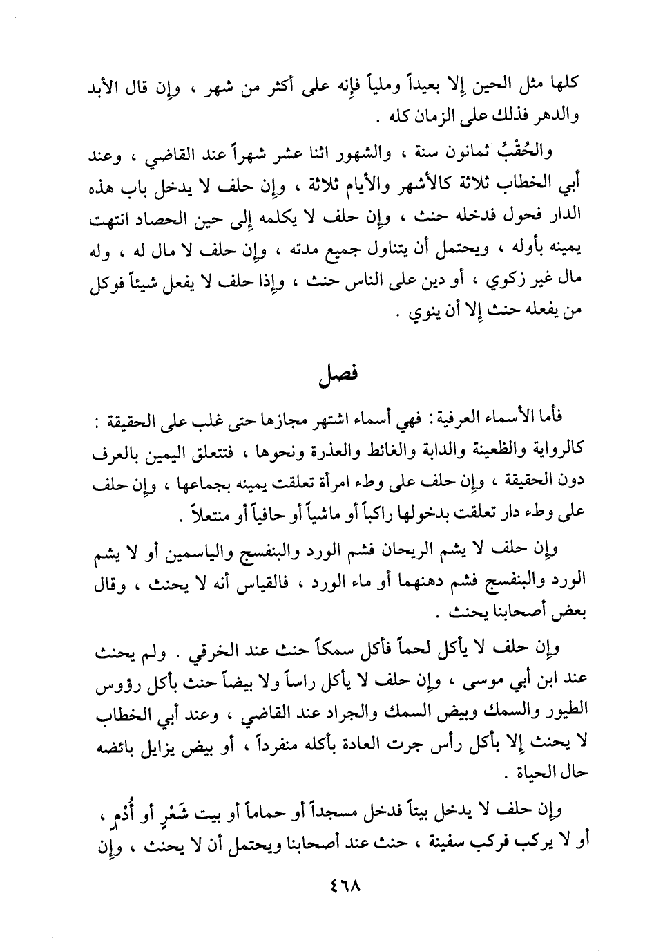 وإِن حلف لا يأكل لحماً فأكل سمكاً حنث عند الخرقي. ولم يحنث عند ابن أبي موسى، وإِن حلف لا يأكل راساً ولا بيضاً حنث بأكل رؤوس الطيور والسمك وبيض السمك والجراد عند القاضي، وعند أبي الخطاب لا يحنث إِلا بأكل رأس جرت العادة بأكله منفرداً، أو بيض يزايل بائضه حال الحياة.
