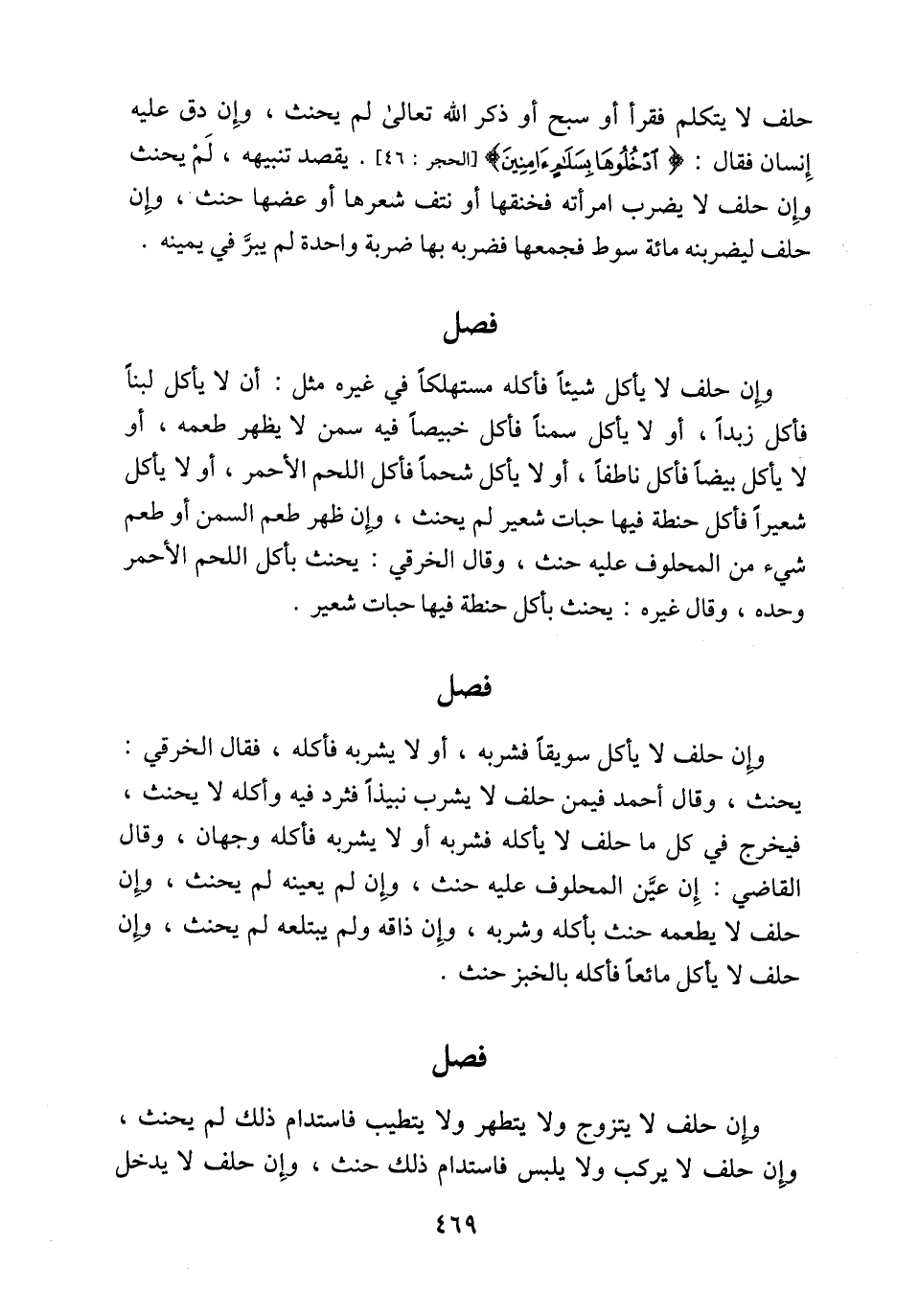 حلف لا يتكلم فقرأ أو سبح أو ذكر الله تعالى لم يحنث، وإِن دق عليه إِنسان فقال: {ادْخُلُوهَا بِسَلَامٍ آمِنِينَ} [الحجر: 46]. يقصد تنبيهه، لَمْ يحنث وإِن حلف لا يضرب امرأته فخنقها أو نتف شعرها أو عضها حنث، وإِن حلف ليضربنه مائة سوط فجمعها فضربه بها ضربة واحدة لم يبرَّ في يمينه.