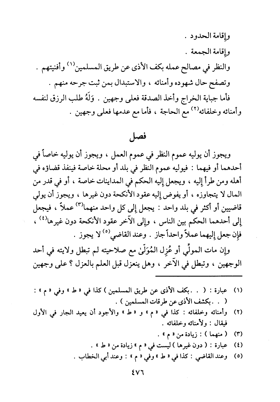 ويجوز أن يوليه عموم النظر في عموم العمل، ويجوز أن يوليه خاصاً في أحدهما أو فيهما: فيوليه عموم النظر في بلد أو محلة خاصة فينفذ قضاؤه في أهله ومن طرأ إِليه، ويجعل إِليه الحكم في المداينات خاصة، أو في قدر من المال لا يتجاوزه، أو يفوض إِليه عقود الأنكحة دون غيرها، ويجوز أن يولي قاضيين أو أكثر في بلد واحد: يجعل إِلى كل واحد منهما (¬3) عملاً، فيجعل إِلى أحدهما الحكم بين الناس، وإِلى الآخر عقود الأنكحة دون غيرها (¬4)، فإِن جعل إِليهما عملاً واحداً جاز. وعند القاضي (¬5) لا يجوز.
