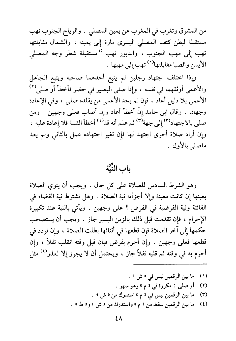 وهو الشرط السادس للصلاة على كل حال. ويجب أن ينوي الصلاة بعينها إِن كانت معينة وإِلا أجزأته نية الصلاة. وهل تشترط نية القضاء في الفائتة ونية الفرضية في الفرض؟ على وجهين. ويأتي بالنية عند تكبيرة الإِحرام، فإن تقدمت قبل ذلك بالزمن اليسير جاز. ويجب أن يستصحب حكمها إِلى آخر الصلاة فإِن قطعها في أثنائها بطلت الصلاة، وإِن تردد في قطعها فعلى وجهين. وإِن أحرم بفرض فبان قبل وقته انقلب نفلًا، وإِن أحرم به في وقته ثم قلبه نفلًا جاز، ويحتمل أن لا يجوز إِلا لعذر (¬4)] مثل