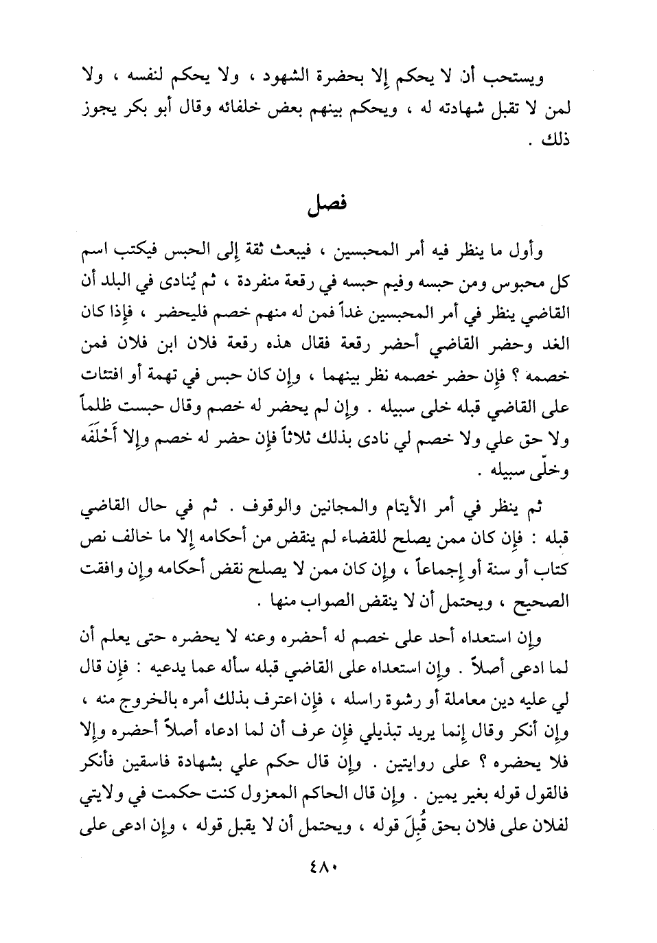 وأول ما ينظر فيه أمر المحبسين، فيبعث ثقة إِلى الحبس فيكتب اسم كل محبوس ومن حبسه وفيم حبسه في رقعة منفردة، ثم يُنادى في البلد أن القاضي ينظر في أمر المحبسين غداً فمن له منهم خصم فليحضر، فإِذا كان الغد وحضر القاضي أحضر رقعة فقال هذه رقعة فلان ابن فلان فمن خصمة؟ فإِن حضر خصمه نظر بينهما، وإِن كان حبس في تهمة أو افتئات على القاضي قبله خلى سبيله. وإِن لم يحضر له خصم وقال حبست ظلماً ولا حق علي ولا خصم لي نادى بذلك ثلاثاً فإِن حضر له خصم وإِلا أَحْلَفَه وخلّى سبيله.