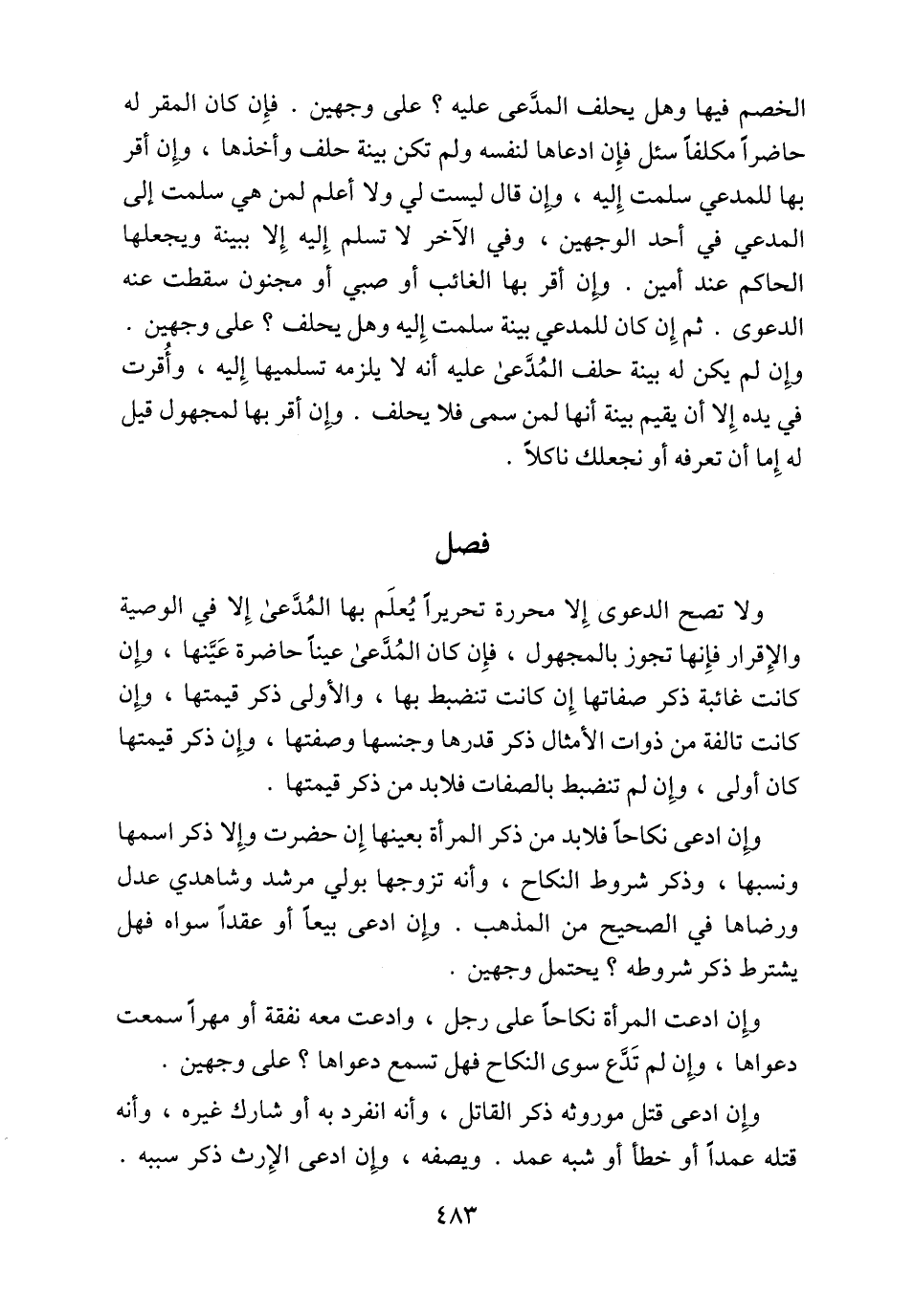 وإِن ادعى نكاحاً فلابد من ذكر المرأة بعينها إِن حضرت وإِلا ذكر اسمها ونسبها، وذكر شروط النكاح، وأنه تزوجها بولي مرشد وشاهدي عدل ورضاها في الصحيح من المذهب. وإِن ادعى بيعاً أو عقداً سواه فهل يشترط ذكر شروطه؟ يحتمل وجهين.