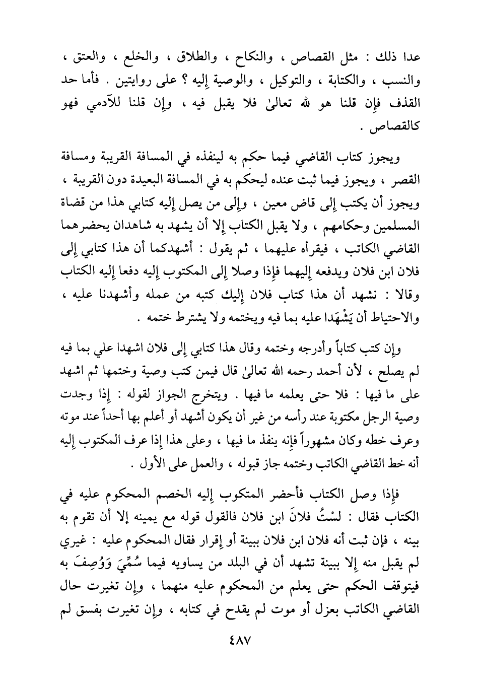 ويجوز كتاب القاضي فيما حكم به لينفذه في المسافة القريبة ومسافة القصر، ويجوز فيما ثبت عنده ليحكم به في المسافة البعيدة دون القريبة، ويجوز أن يكتب إِلى قاض معين، وإِلى من يصل إِليه كتابي هذا من قضاة المسلمين وحكامهم، ولا يقبل الكتاب إِلا أن يشهد به شاهدان يحضرهما القاضي الكاتب، فيقرأه عليهما، ثم يقول: أشهدكما أن هذا كتابي إِلى فلان ابن فلان ويدفعه إِليهما فإِذا وصلا إِلى المكتوب إِليه دفعا إِليه الكتاب وقالا: نشهد أن هذا كتاب فلان إِليك كتبه من عمله وأشهدنا عليه، والاحتياط أن يَشْهَدا عليه بما فيه ويختمه ولا يشترط ختمه.