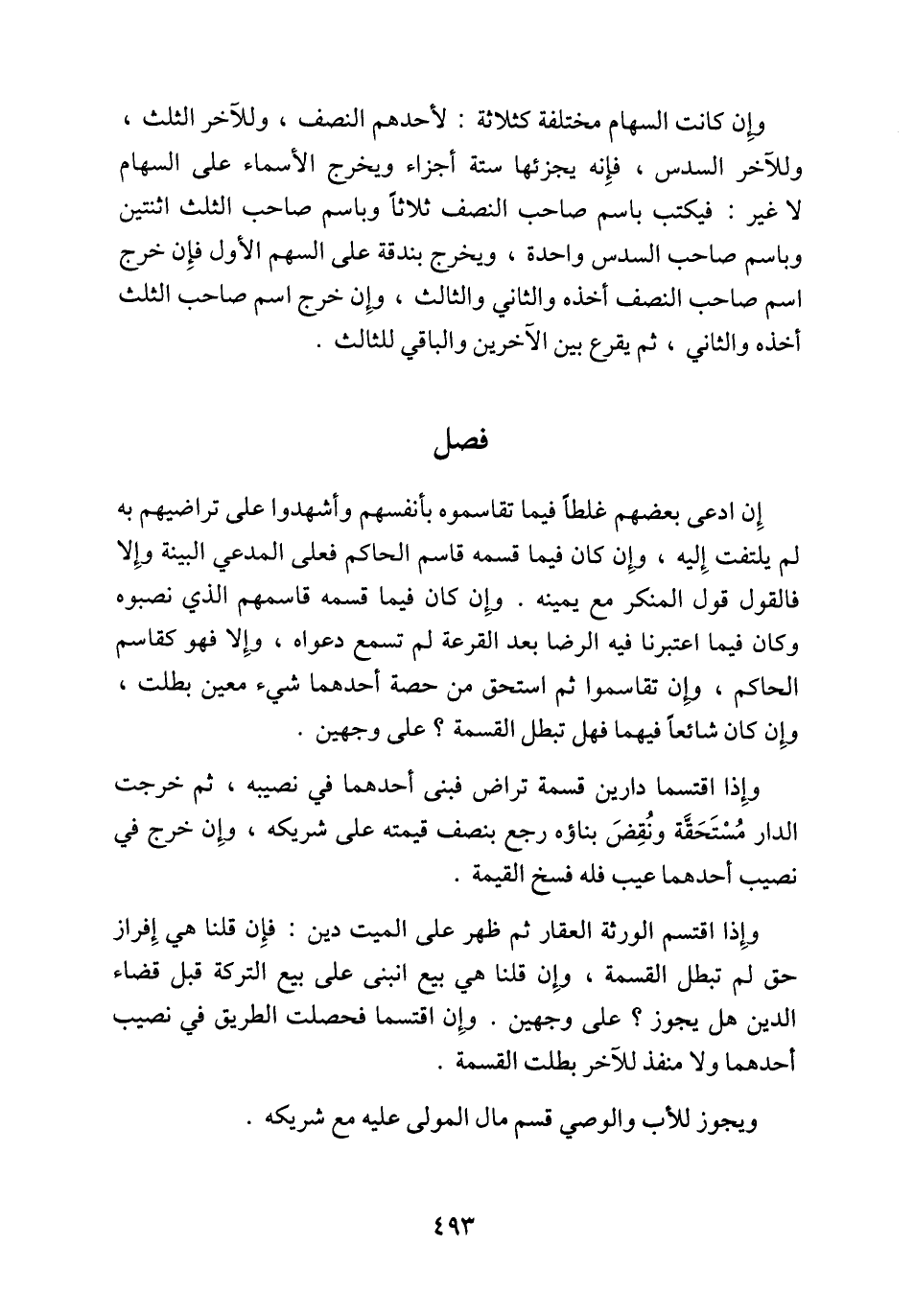 وإِذا اقتسم الورثة العقار ثم ظهر على الميت دين: فإِن قلنا هي إِفراز حق لم تبطل القسمة، وإِن قلنا هي بيع انبنى على بيع التركة قبل قضاء الدين هل يجوز؟ على وجهين. وإِن اقتسما فحصلت الطريق في نصيب أحدهما ولا منفذ للآخر بطلت القسمة.