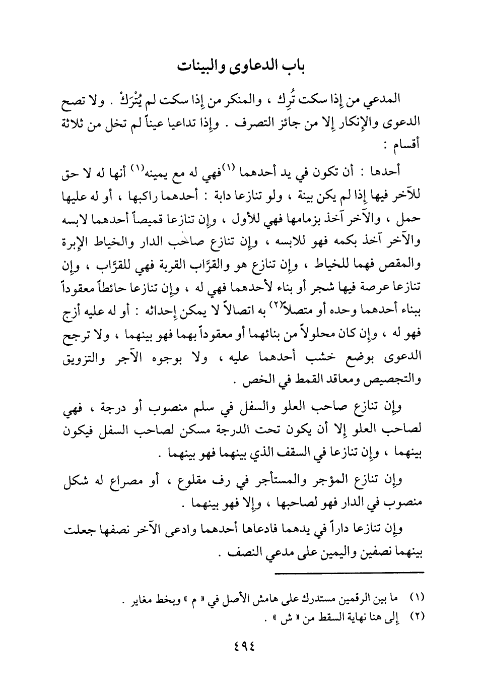 أحدها: أن تكون في يد أحدهما [فهي له مع يمينه (¬1)] أنها له لا حق للآخر فيها إِذا لم يكن بينة، ولو تنازعا دابة: أحدهما راكبها، أو له عليها حمل، والآخر آخذ بزمامها فهي للأول، وإِن تنازعا قميصاً أحدهما لابسه والآخر آخذ بكمه فهو للابسه، وإِن تنازع صاحب الدار والخياط الإِبرة والمقص فهما للخياط، وإِن تنازع هو والقرَّاب القربة فهي للقرَّاب، وإِن تنازعا عرصة فيها شجر أو بناء لأحدهما فهي له، وإِن تنازعا حائطاً معقوداً ببناء أحدهما وحده أو متصلاً (¬2) به اتصالاً لا يمكن إِحداثه: أو له عليه أزج فهو له، وإِن كان محلولاً من بنائهما أو معقوداً بهما فهو بينهما، ولا ترجح الدعوى بوضع خشب أحدهما عليه، ولا بوجوه الآجر والتزويق والتجصيص ومعاقد القمط في الخص.