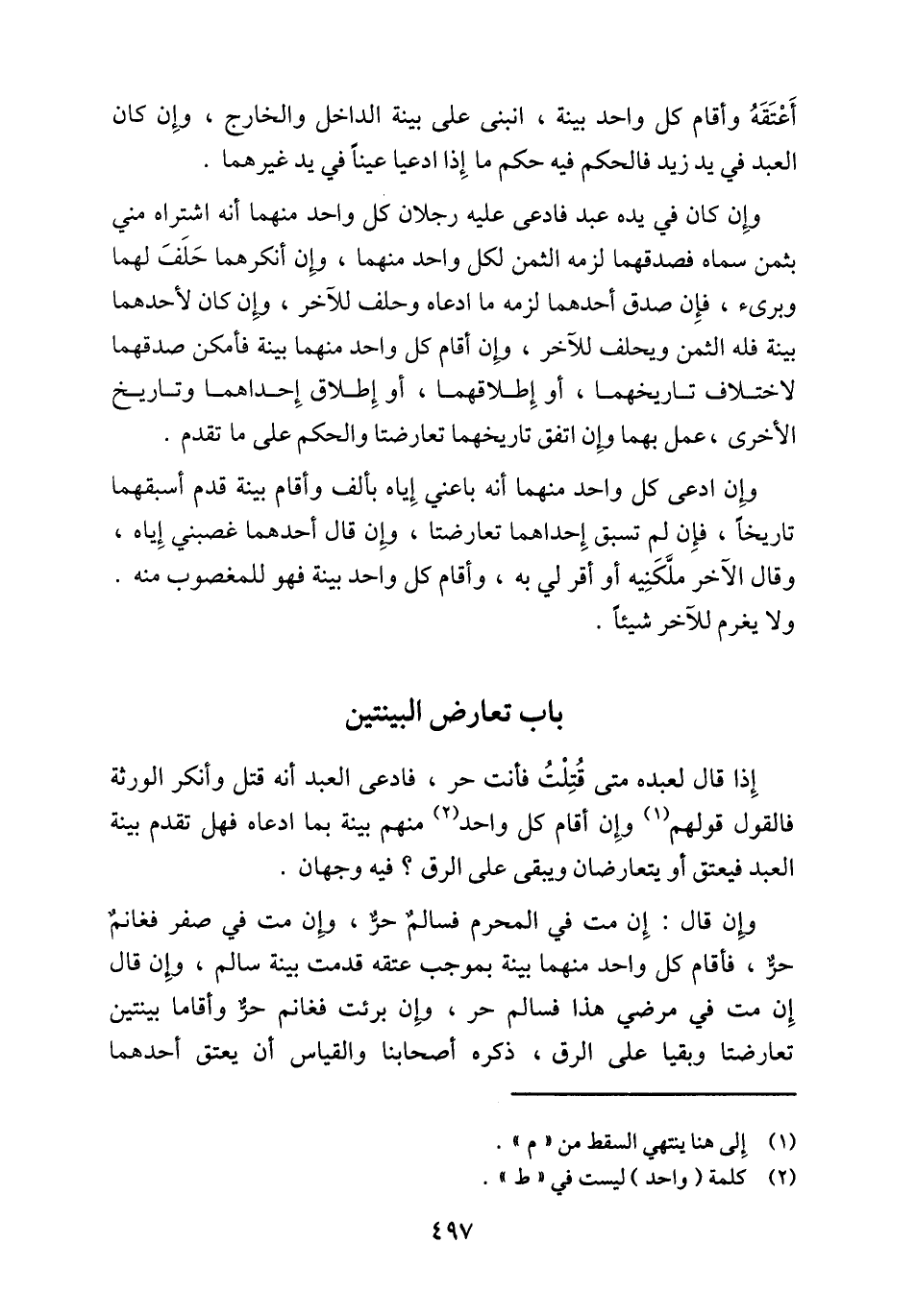 وإِن قال: إِن مت في المحرم فسالمٌ حرٌّ، وإِن مت في صفر فغانمٌ حرٌّ، فأقام كل واحد منهما بينة بموجب عتقه قدمت بينة سالم، وإِن قال إِن مت في مرضي هذا فسالم حر، وإِن برئت فغانم حرٌّ وأقاما بينتين تعارضتا وبقيا على الرق، ذكره أصحابنا والقياس أن يعتق أحدهما