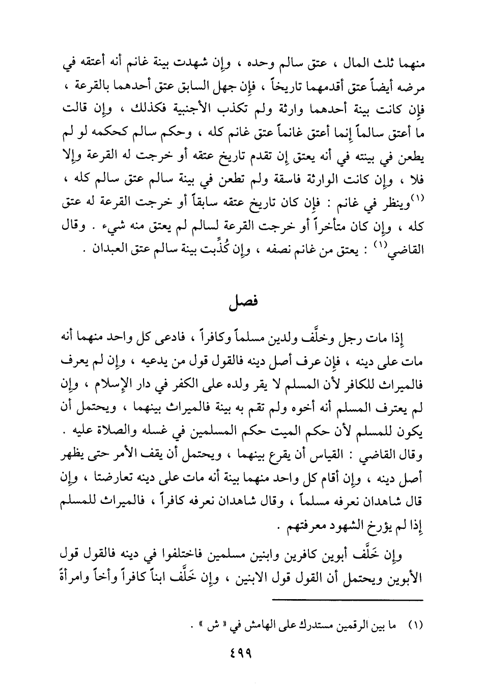 إِذا مات رجل وخلَّف ولدين مسلماً وكافراً، فادعى كل واحد منهما أنه مات على دينه، فإن عرف أصل دينه فالقول قول من يدعيه، وإِن لم يعرف فالميراث للكافر لأن المسلم لا يقر ولده على الكفر في دار الإِسلام، وإِن لم يعترف المسلم أنه أخوه ولم تقم به بينة فالميراث بينهما، ويحتمل أن يكون للمسلم لأن حكم الميت حكم المسلمين في غسله والصلاة عليه. وقال القاضي: القياس أن يقرع بينهما، ويحتمل أن يقف الأمر حتى يظهر أصل دينه، وإِن أقام كل واحد منهما بينة أنه مات على دينه تعارضتا، وإِن قال شاهدان نعرفه مسلماً، وقال شاهدان نعرفه كافراً، فالميراث للمسلم إِذا لم يؤرخ الشهود معرفتهم.