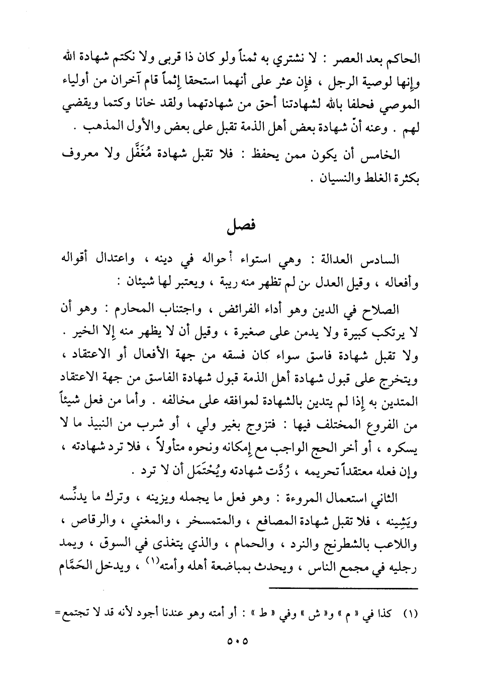 السادس العدالة: وهي استواء أحواله في دينه، واعتدال أقواله وأفعاله، وقيل العدل من لم تظهر منه ريبة، ويعتبر لها شيئان: