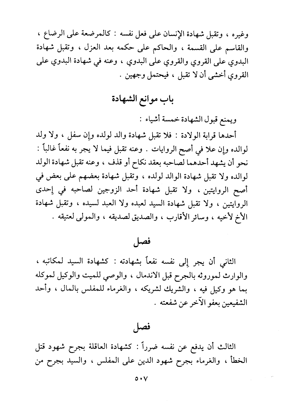 أحدها قرابة الولادة: فلا تقبل شهادة والد لولده وإِن سفل، ولا ولد لوالده وإِن علا في أصح الروايات. وعنه تقبل فيما لا يجر به نفعاً غالباً: نحو أن يشهد أحدهما لصاحبه بعقد نكاح أو قذف، وعنه تقبل شهادة الولد لوالده ولا تقبل شهادة الوالد لولده، وتقبل شهادة بعضهم على بعض في أصح الروايتين، ولا تقبل شهادة أحد الزوجين لصاحبه في إِحدى الروايتين، ولا تقبل شهادة السيد لعبده ولا العبد لسيده، وتقبل شهادة الأخ لأخيه، وسائر الأقارب، والصديق لصديقه، والمولي لعتيقه.