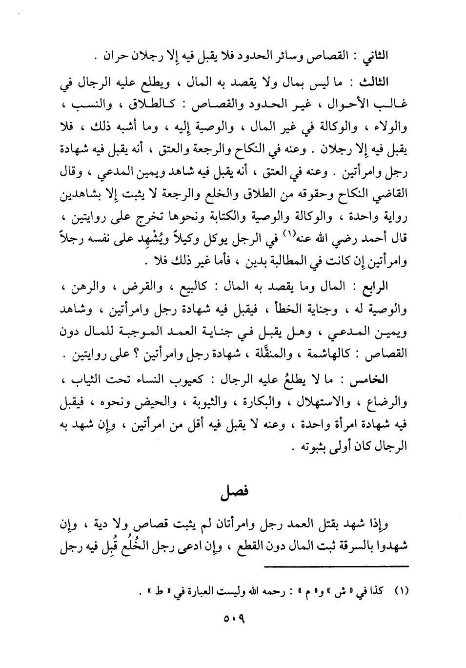 الثالث: ما ليس بمال ولا يقصد به المال، ويطلع عليه الرجال في غالب الأحوال، غير الحدود والقصاص: كالطلاق، والنسب، والولاء، والوكالة في غير المال، والوصية إِليه، وما أشبه ذلك، فلا يقبل فيه إِلا رجلان. وعنه في النكاح والرجعة والعتق، أنه يقبل فيه شهادة رجل وامرأتين. وعنه في العتق، أنه يقبل فيه شاهد ويمين المدعي، وقال القاضي النكاح وحقوقه من الطلاق والخلع والرجعة لا يثبت إِلا بشاهدين رواية واحدة، والوكالة والوصية والكتابة ونحوها تخرج على روايتين، قال أحمد رضي الله عنه (¬1) في الرجل يوكل وكيلاً ويُشْهِد على نفسه رجلاً وامرأتين إِن كانت في المطالبة بدين، فأما غير ذلك فلا.