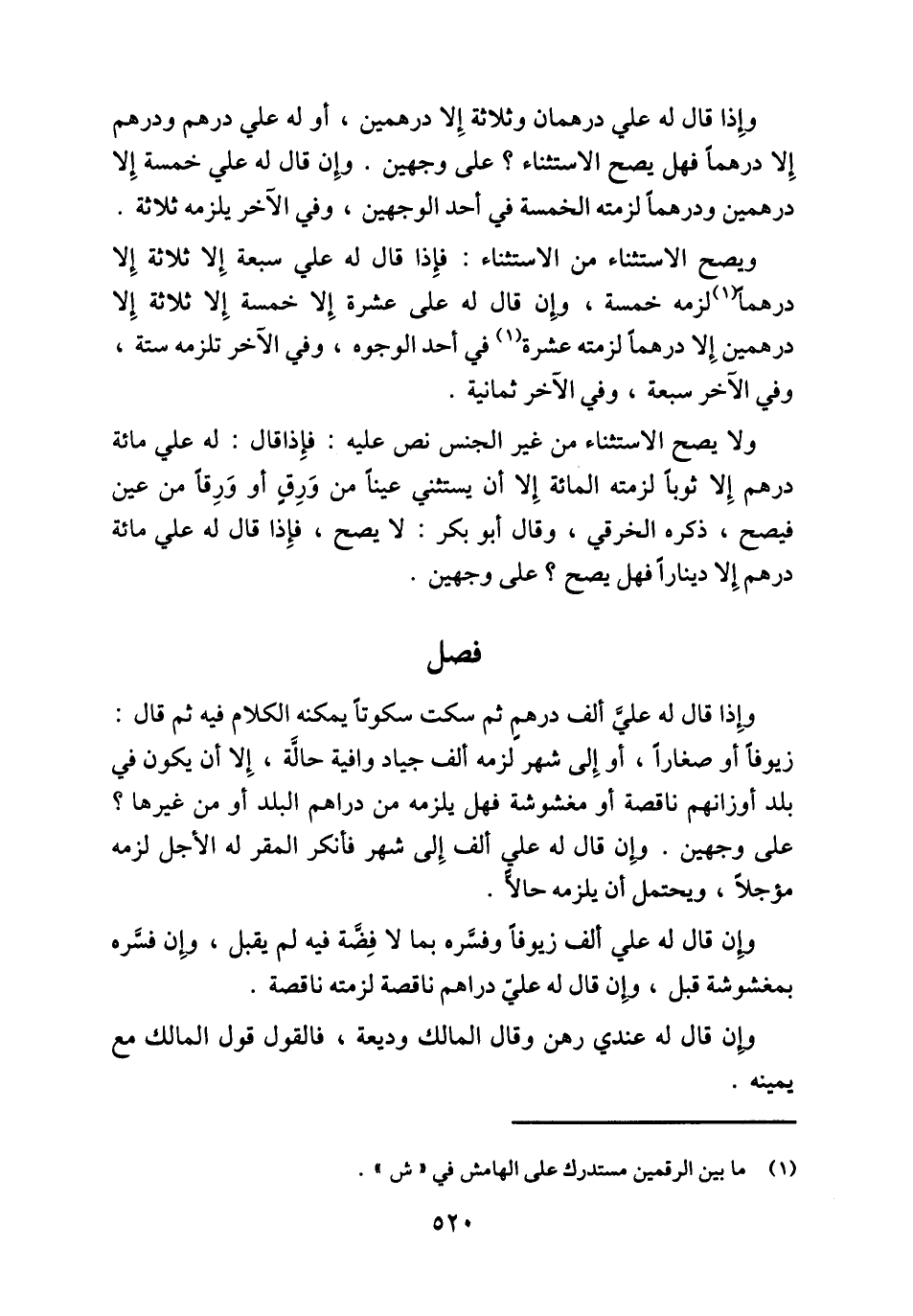 وإِذا قال له علي درهمان وثلاثة إِلا درهمين، أو له علي درهم ودرهم إِلا درهماً فهل يصح الاستثناء؟ على وجهين. وإِن قال له علي خمسة إِلا درهمين ودرهماً لزمته الخمسة في أحد الوجهين، وفي الآخر يلزمه ثلاثة.