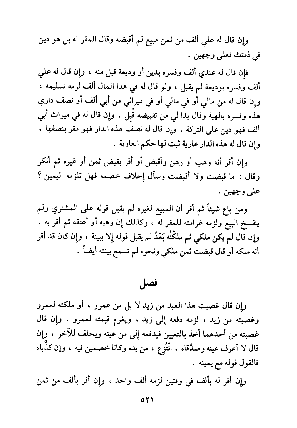 فإِن قال له عندي ألف وفسره بدين أو وديعة قبل منه، وإِن قال له علي ألف وفسره بوديعة لم يقبل، ولو قال له في هذا المال ألف لزمه تسليمه، وإِن قال له من مالي أو في مالي أو في ميراثي من أبي ألف أو نصف داري هذه وفسره بالهبة وقال بدا لي من تقبيضه قُبِل. وإِن قال له في ميراث أبي ألف فهو دين على التركة، وإِن قال له نصف هذه الدار فهو مقر بنصفها، وإِن قال له هذه الدار عاريةً ثبت لها حكم العارية.