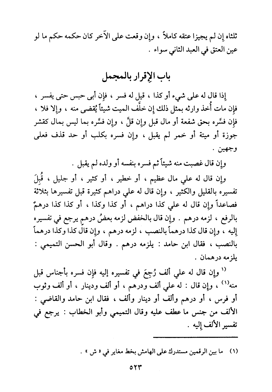 وإِن قال له علي مال عظيم، أو خطير، أو كثير، أو جليل، قُبِلَ تفسيره بالقليل والكثير، وإِن قال له علي دراهم كثيرة قبل تفسيرها بثلاثة فصاعداً وإِن قال له علي كذا دراهم، أو كذا وكذا، أو كذا كذا درهمٌ بالرفع، لزمه درهم. وإِن قال بالخفض لزمه بعضُ درهمٍ يرجع في تفسيره إِليه، وإِن قال كذا درهماً بالنصب، لزمه درهم، وإِن قال كذا وكذا درهماً بالنصب، فقال ابن حامد: يلزمه درهم. وقال أبو الحسن التميمي: يلزمه درهمان.