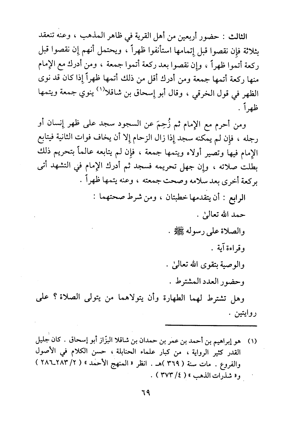 الثالث: حضور أربعين من أهل القرية في ظاهر المذهب، وعنه تنعقد بثلاثة فإِن نقصوا قبل إِتمامها استأنفوا ظهراً، ويحتمل أنهم إِن نقصوا قبل ركعة أتموا ظهراً، وإِن نقصوا بعد ركعة أتموا جمعة، ومن أدرك مع الإِمام منها ركعة أتمها جمعة ومن أدرك أقل من ذلك أتمها ظهراً إِذا كان قد نوى الظهر في قول الخرقي، وقال أبو إِسحاق بن شاقلا (¬1) ينوي جمعة ويتمها ظهراً.