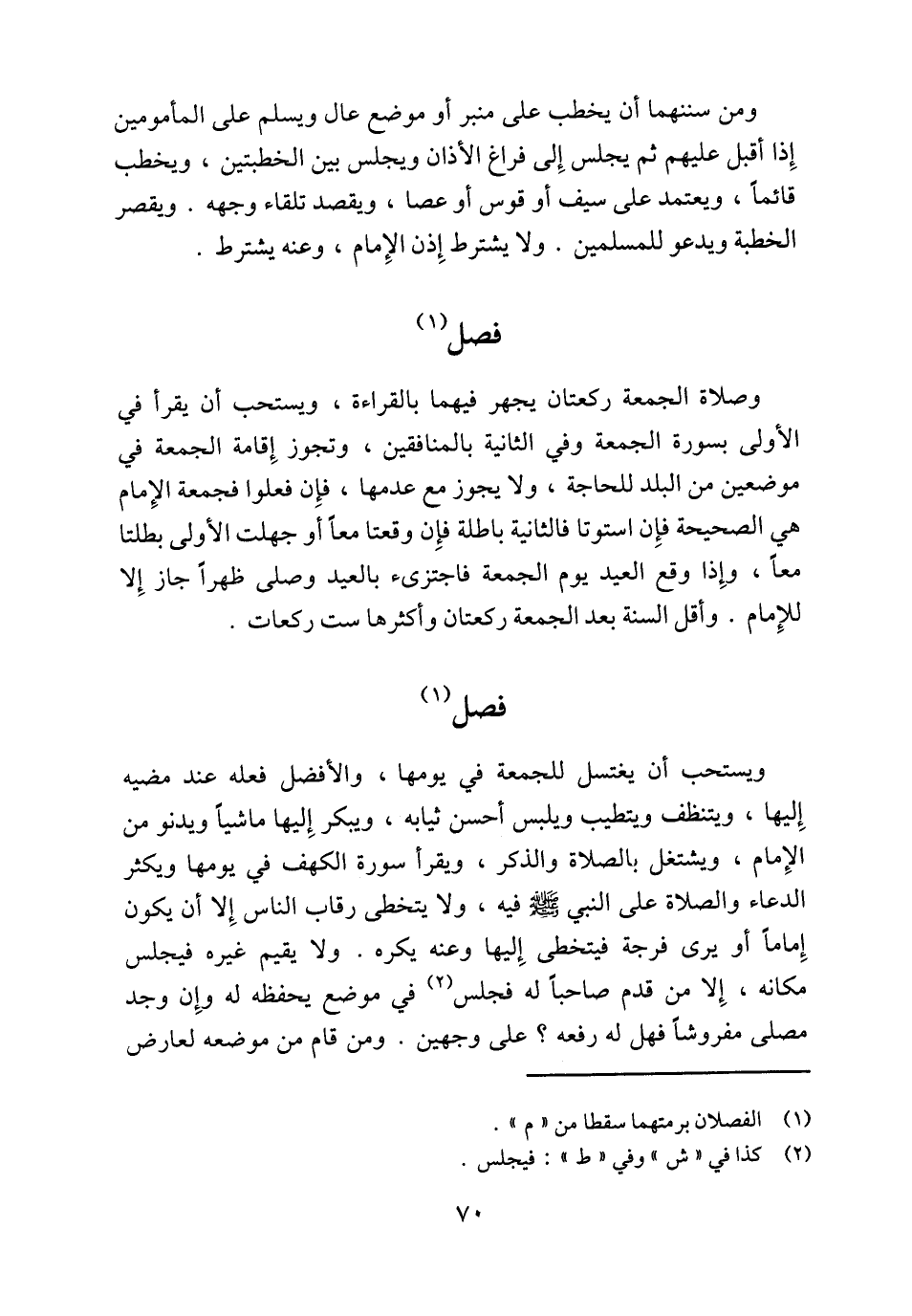ويستحب أن يغتسل للجمعة في يومها، والأفضل فعله عند مضيه إِليها، ويتنظف ويتطيب ويلبس أحسن ثيابه، ويبكر إِليها ماشياً ويدنو من الإِمام، ويشتغل بالصلاة والذكر، ويقرأ سورة الكهف في يومها ويكثر الدعاء والصلاة على النبي - صلى الله عليه وسلم - فيه، ولا يتخطى رقاب الناس إِلا أن يكون إِماماً أو يرى فرجة فيتخطى إِليها وعنه يكره. ولا يقيم غيره فيجلس مكانه، إِلا من قدم صاحباً له فجلس (¬2) في موضع يحفظه له وإِن وجد مصلى مفروشاً فهل له رفعه؟ على وجهين. ومن قام من موضعه لعارض