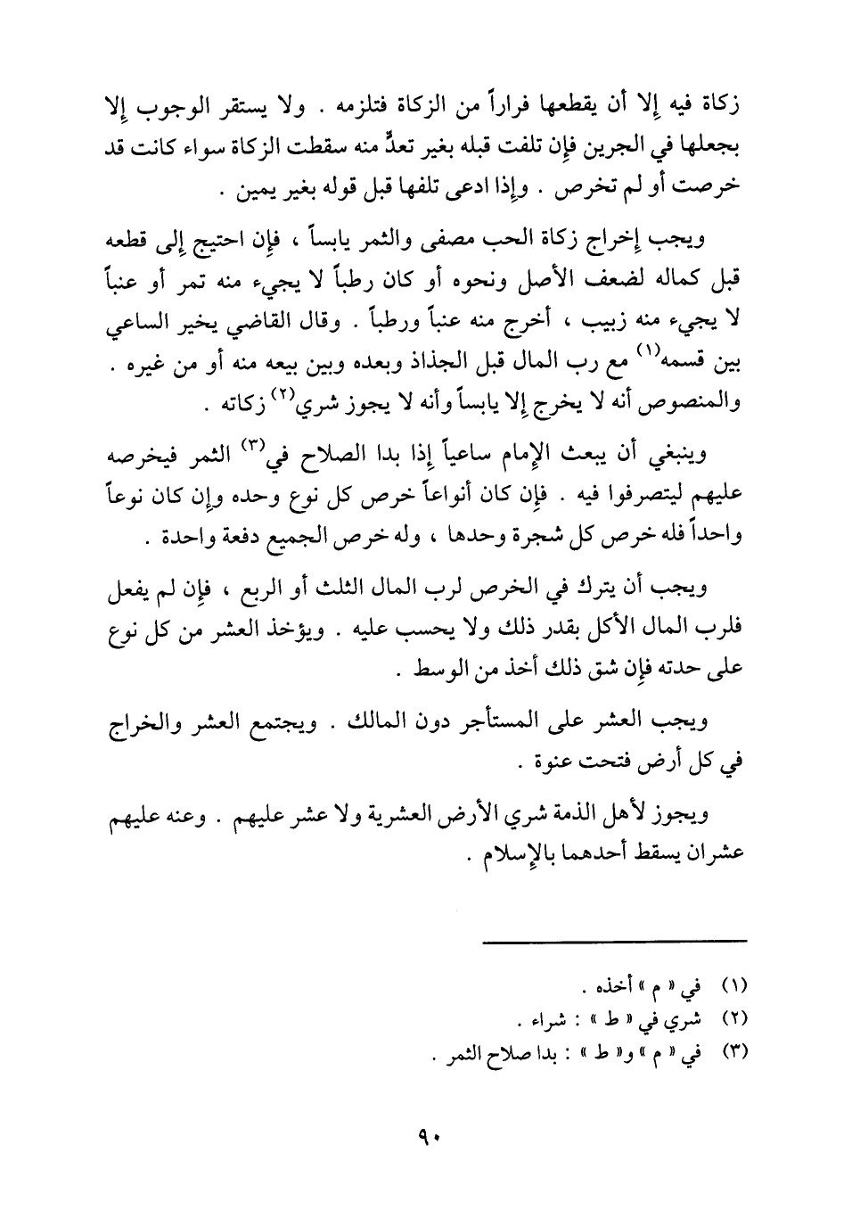ويجب إِخراج زكاة الحب مصفى والثمر يابساً، فإِن احتيج إِلى قطعه قبل كماله لضعف الأصل ونحوه أو كان رطباً لا يجيء منه تمر أو عنباً لا يجيء منه زبيب، أخرج منه عنباً ورطباً. وقال القاضي يخير الساعي بين قسمه (¬1) مع رب المال قبل الجذاذ وبعده وبين بيعه منه أو من غيره. والمنصوص أنه لا يخرج إِلا يابساً وأنه لا يجوز شري (¬2) زكاته.