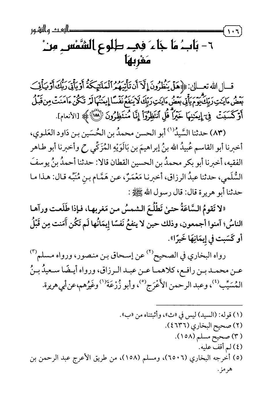 83 - حدثنا السيد أبو الحسن محمد بن الحسين بن داود العلوي، أخبرنا أبو القاسم عبيد الله بن إبراهيم بن بالويه المزكي ح وأخبرنا أبو طاهر الفقيه، أخبرنا أبو بكر محمد بن الحسين القطان قالا: حدثنا أحمد بن يوسف السلمي، حدثنا عبد الرزاق، أخبرنا معمر، عن همام بن منبه قال: هذا ما حدثنا أبو هريرة قال: قال رسول الله صلى الله عليه وسلم: "لا تقوم الساعة حتى تطلع الشمس من مغربها، فإذا طلعت ورآها الناس، آمنوا أجمعون، وذلك حين لا ينفع نفسا إيمانها لم تكن آمنت من قبل أو كسبت في إيمانها خيرا". رواه البخاري في الصحيح عن إسحاق بن منصور، ورواه مسلم عن محمد بن رافع، كلاهما عن عبد الرزاق، ورواه أيضا سعيد بن المسيب، وعبد الرحمن الأعرج، وأبو زرعة وغيرهم، عن أبي هريرة.