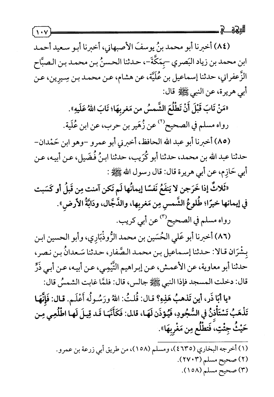 84 - أخبرنا أبو محمد بن يوسف الأصبهاني، أخبرنا أبو سعيد أحمد بن محمد بن زياد البصري -بمكة- حدثنا الحسن بن محمد بن الصباح الزعفراني، حدثنا إسماعيل بن علية، عن هشام، عن محمد بن سيرين، عن أبي هريرة، عن النبي صلى الله عليه وسلم قال: "من تاب قبل أن تطلع الشمس من مغربها، تاب الله عليه". رواه مسلم في الصحيح عن زهير بن حرب، عن ابن علية.