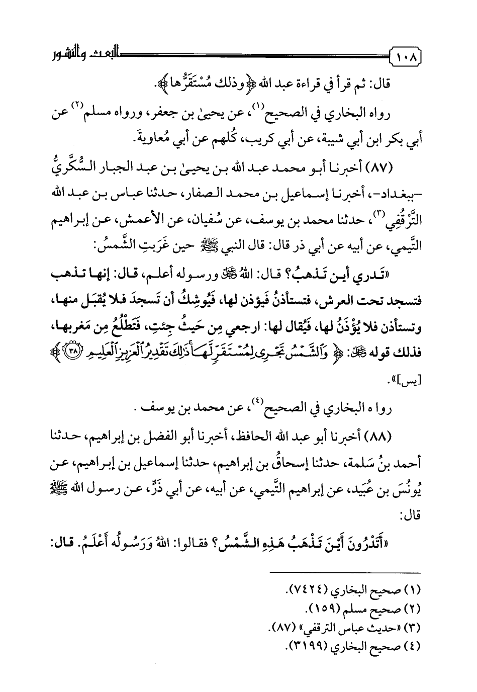 88 - أخبرنا أبو عبد الله الحافظ، أخبرنا أبو الفضل بن إبراهيم، حدثنا أحمد بن سلمة، حدثنا إسحاق بن إبراهيم، حدثنا إسماعيل بن إبراهيم، عن يونس بن عبيد، عن إبراهيم التيمي، عن أبيه، عن أبي ذر، عن رسول الله صلى الله عليه وسلم قال: "أتدرون أين تذهب هذه الشمس؟ فقالوا: الله ورسوله أعلم. قال: فإنها تجرى حتى تنتهي إلى مستقرها تحت العرش، فتخر ساجدة، فلا تزال كذلك حتى يقال لها ارتفعي، ارجعي من حيث جئت طالعة، فتطلع من مطلعها، ثم تجري حتى تنتهي إلى مستقرها تحت العرش، فتخر ساجدة، فلا تزال كذلك حتى يقال لها ارتفعي، اطلعي من مغربك، فتطلع من مغربها، قال رسول الله صلى الله عليه وسلم: أتدرون متى ذاكم؟ ذاك حين لا ينفع نفسا إيمانها لم تكن آمنت من قبل أو كسبت في إيمانها خيرا". رواه مسلم في الصحيح، عن إسحاق بن إبراهيم.
