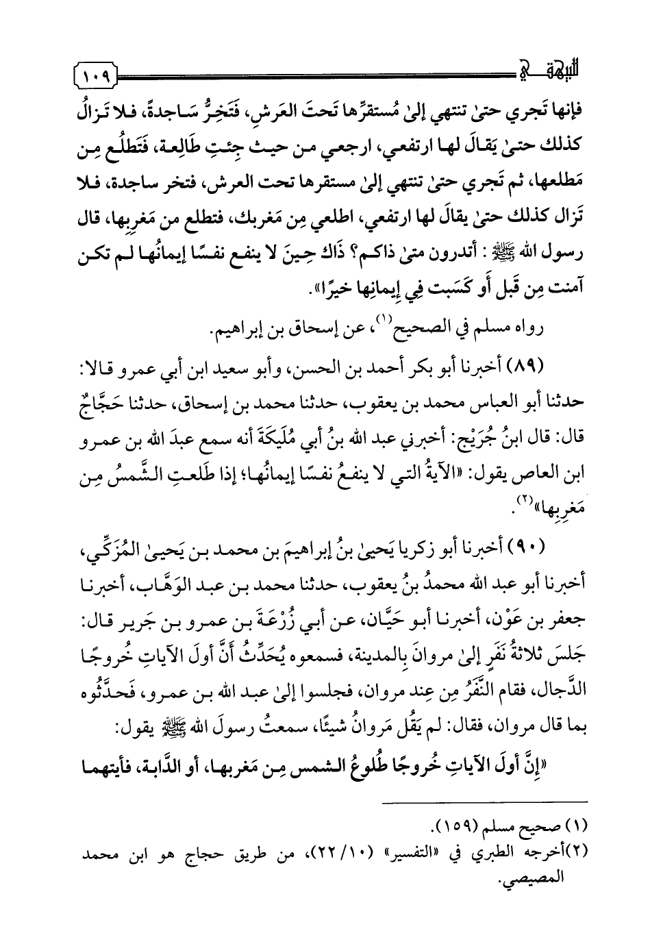 90 - أخبرنا أبو زكريا يحيى بن إبراهيم بن محمد بن يحيى المزكي، أخبرنا أبو عبد الله محمد بن يعقوب، حدثنا محمد بن عبد الوهاب، أخبرنا جعفر بن عون، أخبرنا أبو حيان، عن أبي زرعة بن عمرو بن جرير قال: جلس ثلاثة نفر إلى مروان بالمدينة، فسمعوه يحدث أن أول الآيات خروجا الدجال، فقام النفر من عند مروان، فجلسوا إلى عبد الله بن عمرو، فحدثوه بما قال مروان، فقال: لم يقل مروان شيئا، سمعت رسول الله صلى الله عليه وسلم يقول: "إن أول الآيات خروجا طلوع الشمس من مغربها، أو الدابة، فأيتهما كانت قبل الأخرى، على إثرها قريب، ثم أنشأ يحدث، وذلك أن الشمس إذا غربت أتت تحت العرش فسجدت، فاستأذنت في الرجوع فيؤذن لها، فإذا أراد الله أن تطلع من مغربها أتت تحت العرش، فسجدت واستأذنت في الرجوع فلا يرد عليها شيئا، ثم تعود فتستأذن فلا يرد عليها شيئا، قال: وعلمت أنه لو أذن لم تدرك المشرق، قالت رب ما أبعد المشرق! من لي بالناس؟ فإذا كان الأفق كالطوق قيل لها اطلعي من مكانك". قال: وقد كان عبد الله يقرأ الكتب فقرأ: وذلك يوم لا ينفع نفسا إيمانها لم تكن آمنت من قبل أو كسبت في إيمانها خيرا.