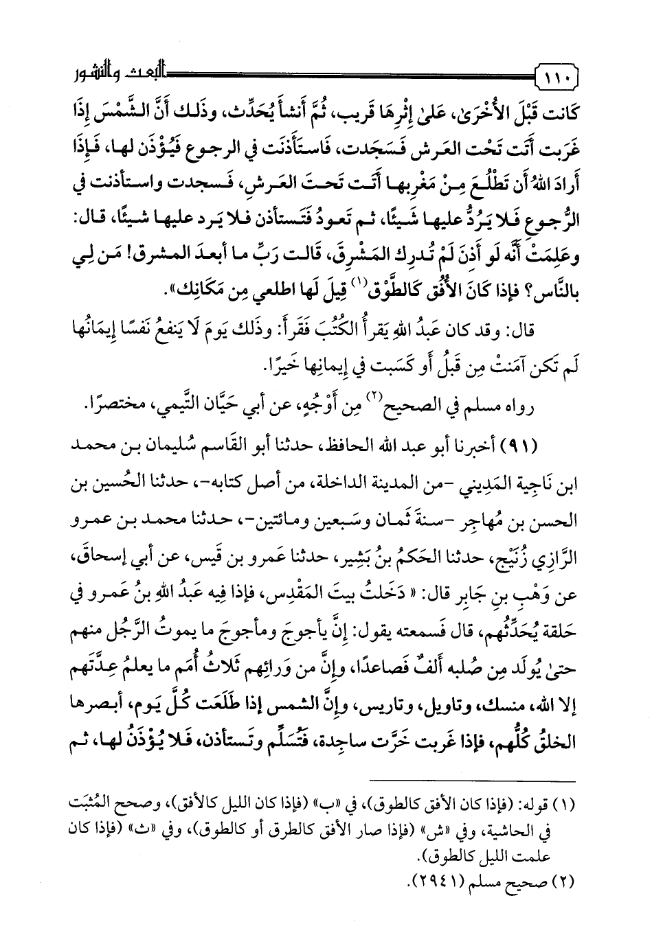 91 - أخبرنا أبو عبد الله الحافظ، حدثنا أبو القاسم سليمان بن محمد بن ناجية المديني- من المدينة الداخلة، من أصل كتابه- حدثنا الحسين بن الحسن بن مهاجر- سنة ثمان وسبعين ومائتين- حدثنا محمد بن عمرو الرازي زنيج، حدثنا الحكم بن بشير، حدثنا عمرو بن قيس، عن أبي إسحاق، عن وهب بن جابر قال: "دخلت بيت المقدس، فإذا فيه عبد الله بن عمرو في حلقة يحدثهم، قال فسمعته يقول: إن يأجوج ومأجوج ما يموت الرجل منهم حتى يولد من صلبة ألف فصاعدا، وإن من ورائهم ثلاث أمم ما يعلم عدتهم إلا الله، منسك، وتاويل، وتاريس، وإن الشمس إذا طلعت كل يوم، أبصرها الخلق كلهم، فإذا غربت خرت ساجدة، فتسلم وتستأذن، فلا يؤذن لها، ثم تستأذن، ولا يؤذن لها، ثم الثالثة، فلا يؤذن لها، فتقول: يا رب، إن عبادك ينظروني، والمطلع بعيد، فلا يؤذن لها، حتى إذا كان قدر ليلتين أو ثلاث قيل لها: اطلعي من حيث غربت، فتطلع من المغرب، فيؤمن أهل الأرض كلهم، وهي فيما بلغنا أول الآيات، لا ينفع نفسا إيمانها لم تكن آمنت من قبل، فيذهب الناس فيتصدقون بالذهب والفضة، فلا يؤخذ منهم، ويقال لو كان بالأمس".