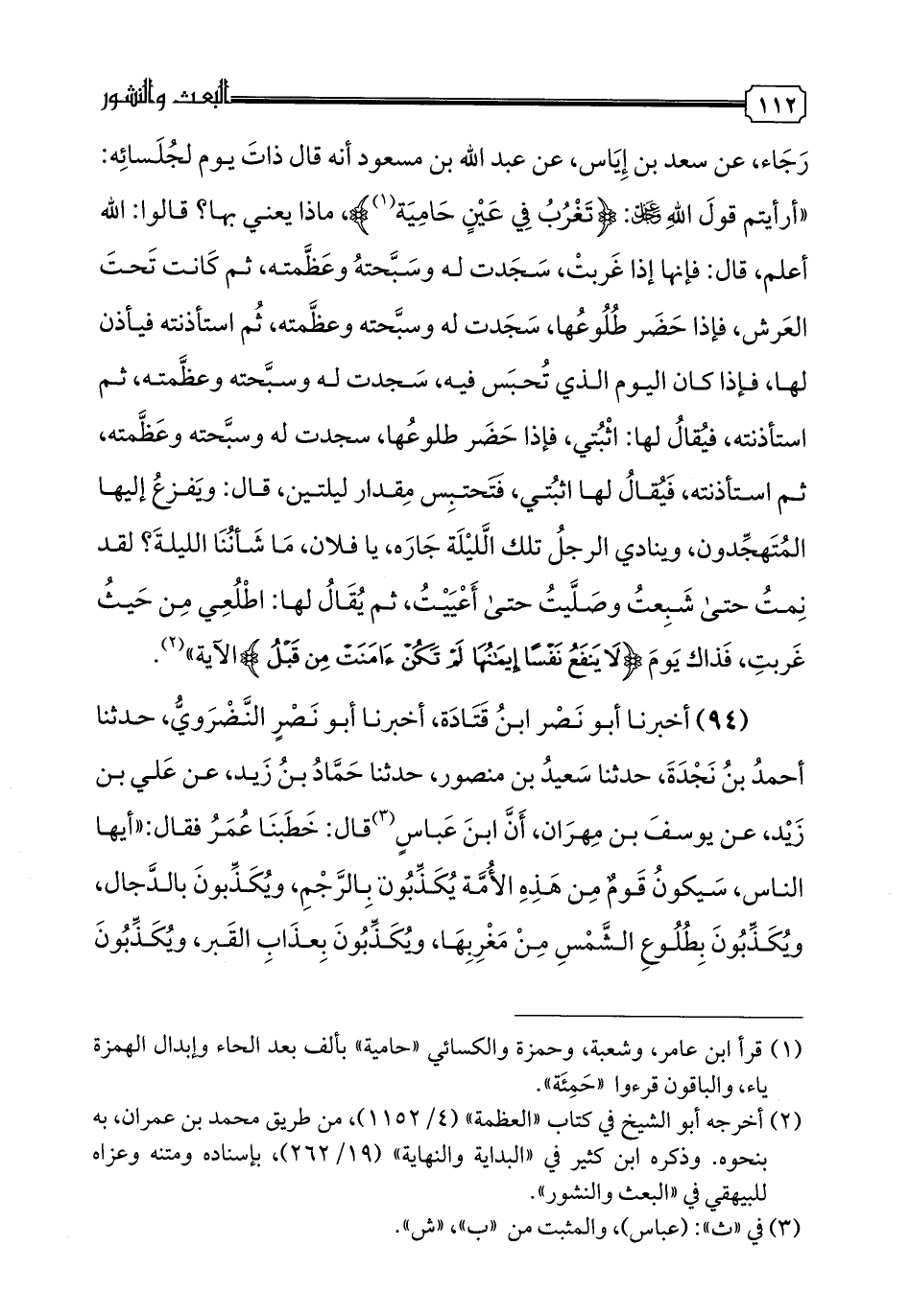 94 - أخبرنا أبو نصر ابن قتادة، أخبرنا أبو نصر النضروي، حدثنا أحمد بن نجدة، حدثنا سعيد بن منصور، حدثنا حماد بن زيد، عن علي بن زيد، عن يوسف بن مهران، أن ابن عباس قال: خطبنا عمر فقال: "أيها الناس، سيكون قوم من هذه الأمة يكذبون بالرجم، ويكذبون بالدجال، ويكذبون بطلوع الشمس من مغربها، ويكذبون بعذاب القبر، ويكذبون بالشفاعة، ويكذبون بقوم يخرجون من النار بعدما امتحشوا".