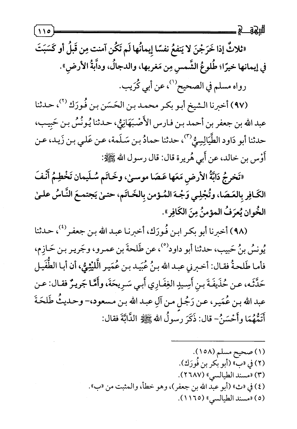 98 - أخبرنا أبو بكر ابن فورك، أخبرنا عبد الله بن جعفر، حدثنا يونس بن حبيب، حدثنا أبو داود، عن طلحة بن عمرو، وجرير بن حازم، فأما طلحة فقال: أخبرني عبد الله بن عبيد بن عمير الليثي، أن أبا الطفيل حدثه، عن حذيفة بن أسيد الغفاري أبي سريحة، وأما جرير فقال: عن عبد الله بن عمير، عن رجل من آل عبد الله بن مسعود -وحديث طلحة أتمهما وأحسن- قال: ذكر رسول الله صلى الله عليه وسلم الدابة فقال: "لها ثلاث خرجات من الدهر، فتخرج في أقصى البادية، ولا يدخل ذكرها القرية -يعني مكة- ثم تكمن زمانا طويلا، ثم تخرج خرجه أخرى دون ذلك، فيفشوا ذكرها في أهل البادية، ويدخل ذكرها القرية -يعني مكة- قال رسول الله صلى الله عليه وسلم: ثم بينما الناس في أعظم المساجد على الله حرمة خيرها وأكرمها المسجد الحرام، لم يرعهم إلا وهي ترغوا بين الركن والمقام، تنفض عن رأسها التراب، فارفض الناس معها شتى ومعا، وثبت عصابة من المؤمنين، وعرفوا أنهم لن يعجزوا الله، فبدأت بهم فجلت وجوههم حتى جعلتها كأنها الكوكب الدري، وولت في الأرض لا يدركها طالب، ولا ينجوا منها هارب، حتى أن الرجل يتعوذ منها بالصلاة فتأتيه من خلفه، فتقول: يا فلان، ألا تصلي الآن؟ فيقبل عليها، فتسمه في وجهه، ثم تنطلق، ويشترك الناس في الأموال، ويصطحبون في الأمصار، يعرف المؤمن من الكافر، حتى إن المؤمن يقول: يا كافر، اقضني حقي، وحتى إن الكافر يقول: يا مؤمن، اقضني حقي". طلحة بن عمرو المكي: غير قوي، ولحديثه شواهد في بعض ألفاظه، والله أعلم.