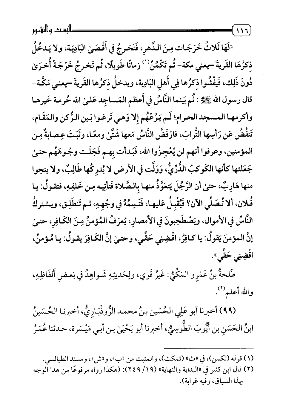 99 - أخبرنا أبو علي الحسين بن محمد الروذباري، أخبرنا الحسين بن الحسن بن أيوب الطوسي، أخبرنا أبو يحيى بن أبي ميسرة، حدثنا عمر بن سهل المازني، حدثنا مهدي بن عمران، عن أبي الطفيل، أنه سئل وأنا عنده، من أين تخرج الدابة؟ قال: "من الصفا، أو من المروة".