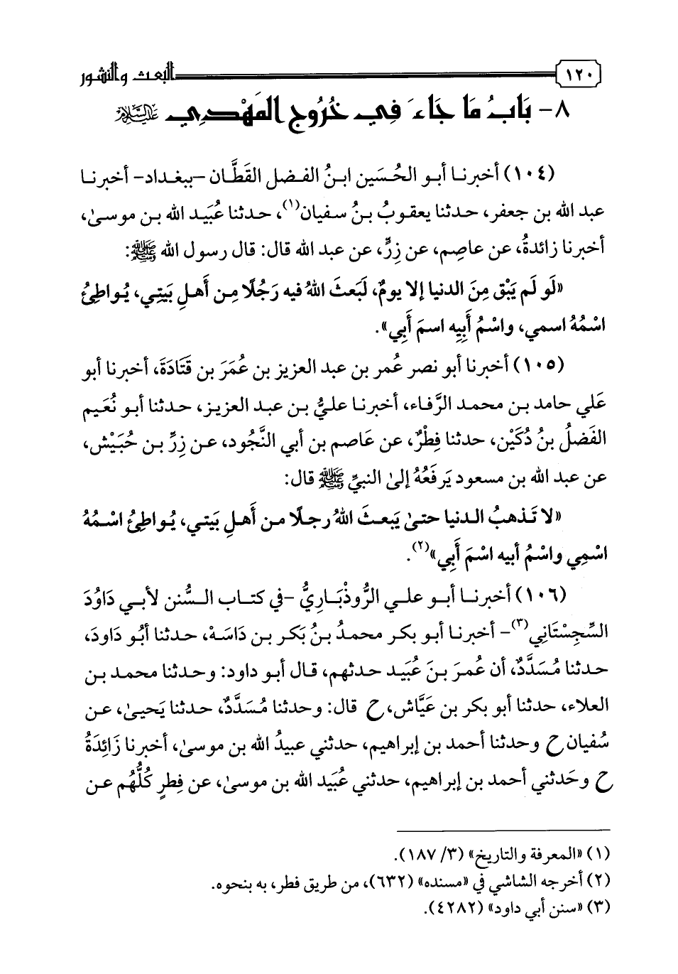 104 - أخبرنا أبو الحسين ابن الفضل القطان-ببغداد- أخبرنا عبد الله بن جعفر، حدثنا يعقوب بن سفيان، حدثنا عبيد الله بن موسى، أخبرنا زائدة، عن عاصم، عن زر، عن عبد الله قال: قال رسول الله صلى الله عليه وسلم: "لو لم يبق من الدنيا إلا يوم، لبعث الله فيه رجلا من أهل بيتي، يواطىء اسمه اسمي، واسم أبيه اسم أبي".