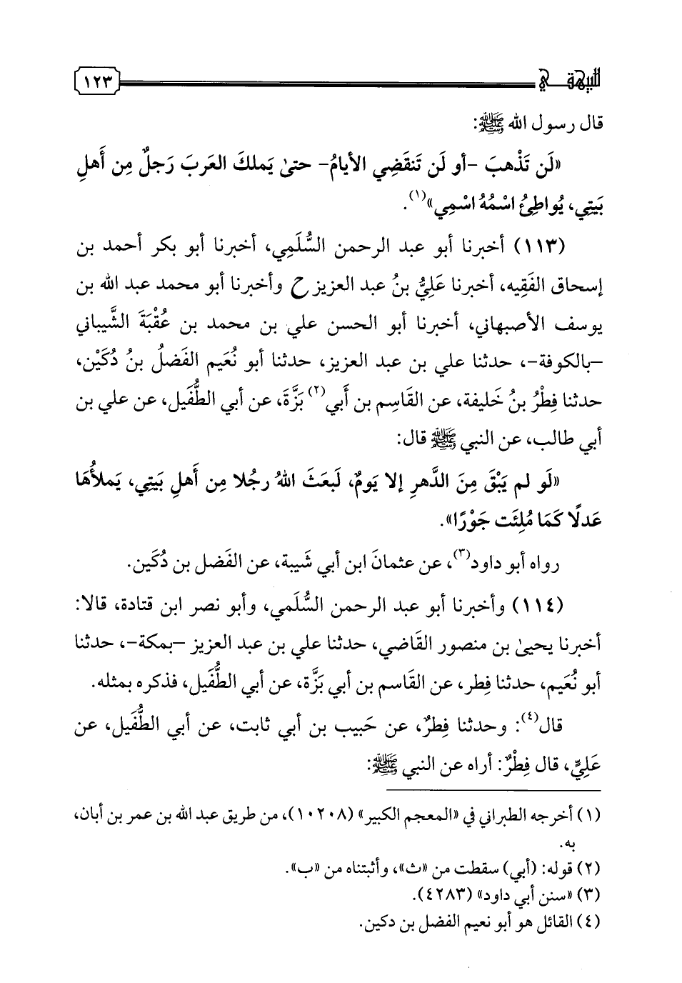 113 - أخبرنا أبو عبد الرحمن السلمي، أخبرنا أبو بكر أحمد بن إسحاق الفقيه، أخبرنا علي بن عبد العزيز ح وأخبرنا أبو محمد عبد الله بن يوسف الأصبهاني، أخبرنا أبو الحسن علي بن محمد بن عقبة الشيباني -بالكوفة- حدثنا علي بن عبد العزيز، حدثنا أبو نعيم الفضل بن دكين، حدثنا فطر بن خليفة، عن القاسم بن أبي بزة، عن أبي الطفيل، عن علي بن أبي طالب، عن النبي صلى الله عليه وسلم قال: " لو لم يبق من الدهر إلا يوم، لبعث الله رجلا من أهل بيتي، يملأها عدلا كما ملئت جورا". رواه أبو داود، عن عثمان بن أبي شيبة، عن الفضل بن دكين.