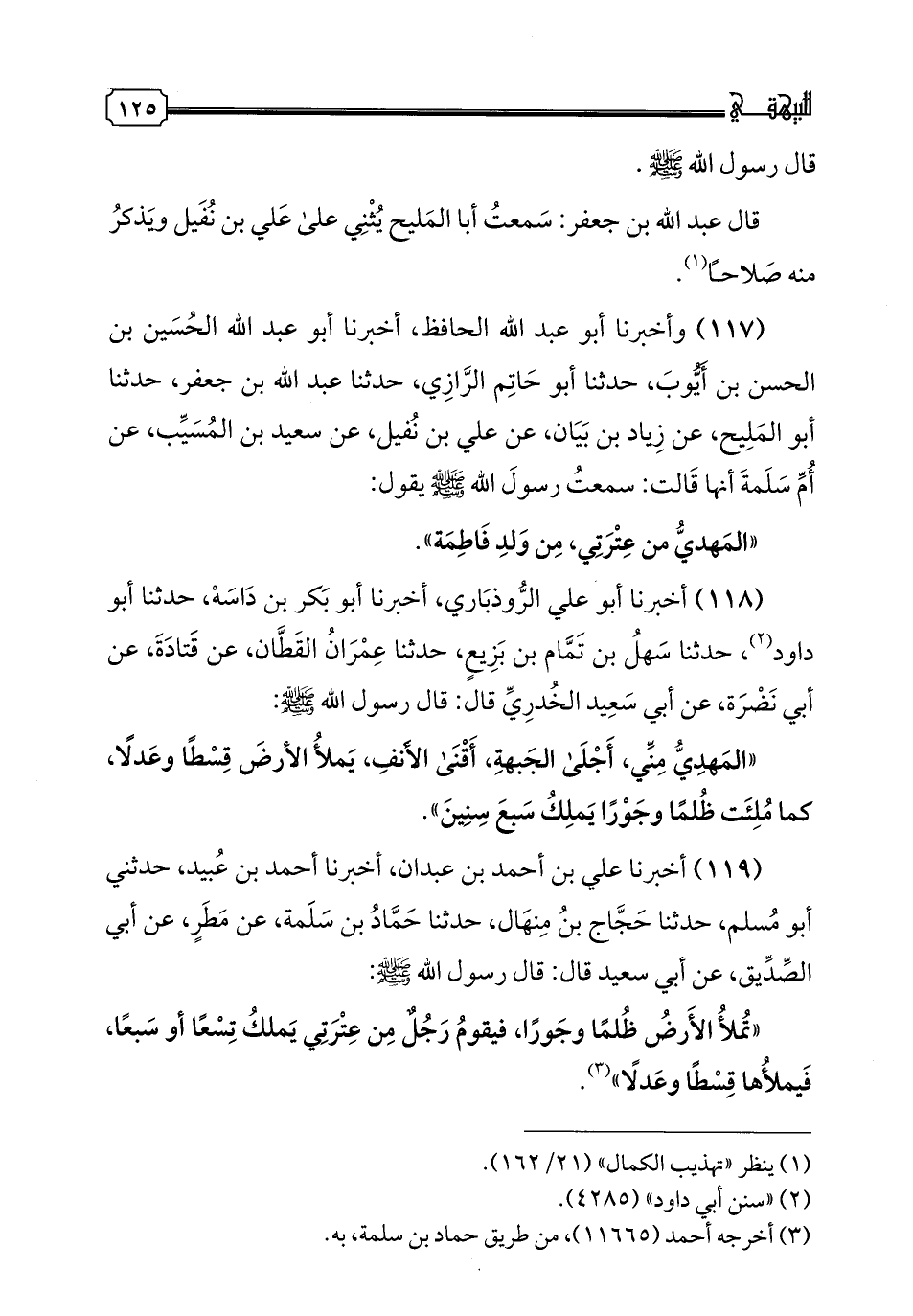 117 - وأخبرنا أبو عبد الله الحافظ، أخبرنا أبو عبد الله الحسين بن الحسن بن أيوب، حدثنا أبو حاتم الرازي، حدثنا عبد الله بن جعفر، حدثنا أبو المليح، عن زياد بن بيان، عن علي بن نفيل، عن سعيد بن المسيب، عن أم سلمة أنها قالت: سمعت رسول الله صلى الله عليه وسلم يقول: "المهدي من عترتي، من ولد فاطمة".