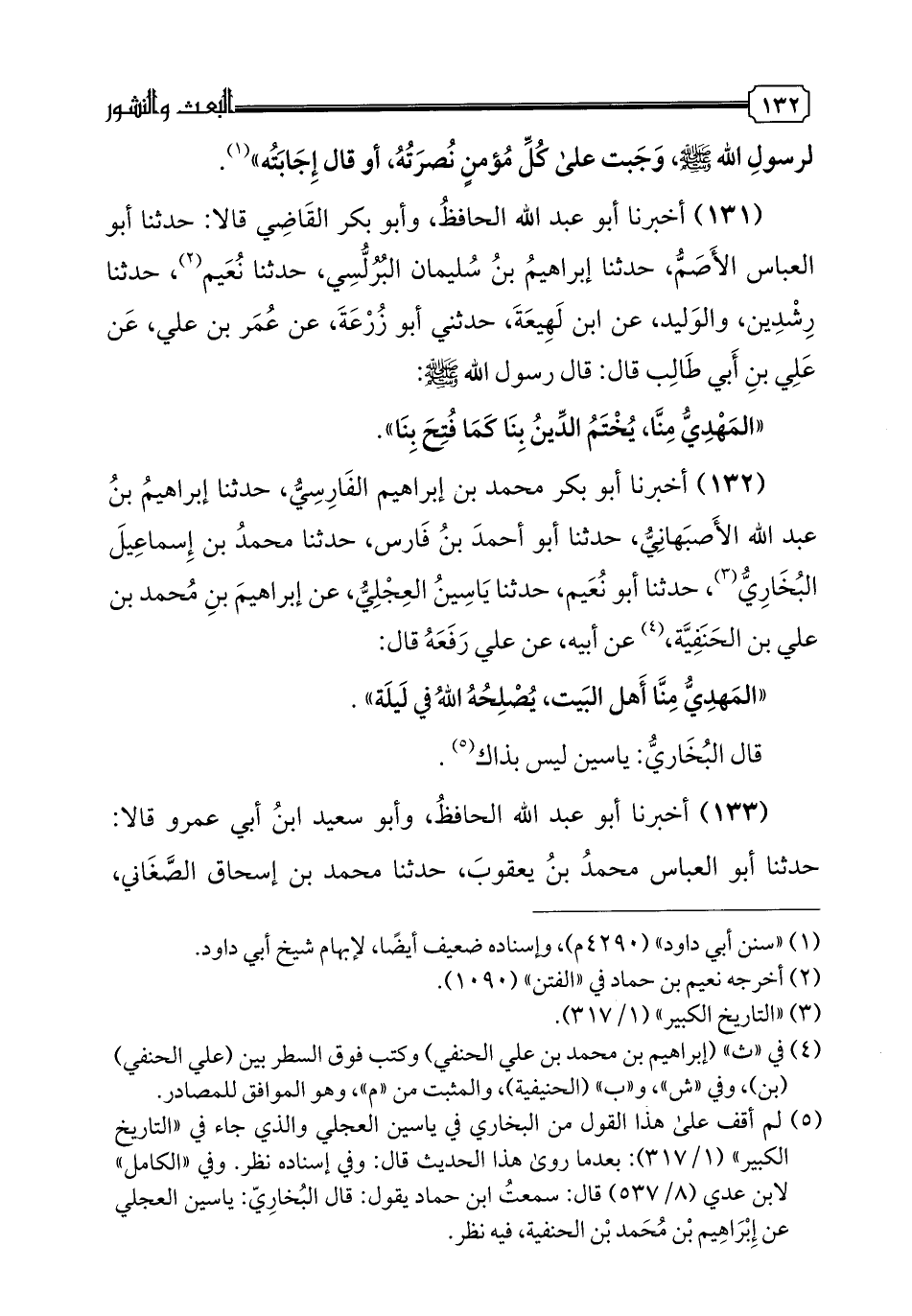 132 - أخبرنا أبو بكر محمد بن إبراهيم الفارسي، حدثنا إبراهيم بن عبد الله الأصبهاني، حدثنا أبو أحمد بن فارس، حدثنا محمد بن إسماعيل البخاري، حدثنا أبو نعيم، حدثنا ياسين العجلي، عن إبراهيم بن محمد بن علي بن الحنفية، عن أبيه، عن علي رفعه قال: "المهدي منا أهل البيت، يصلحه الله في ليلة". قال البخاري: ياسين ليس بذاك.