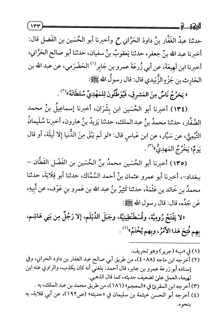 134 - أخبرنا أبو الحسين بن بشران، أخبرنا إسماعيل بن محمد الصفار، حدثنا محمد بن عبد الملك، حدثنا يزيد بن هارون، أخبرنا سليمان التيمي، عن سيار، عن ابن عباس قال: "لو لم يبق من الدنيا إلا ليلة، أو قال يوم يخرج المهدي".