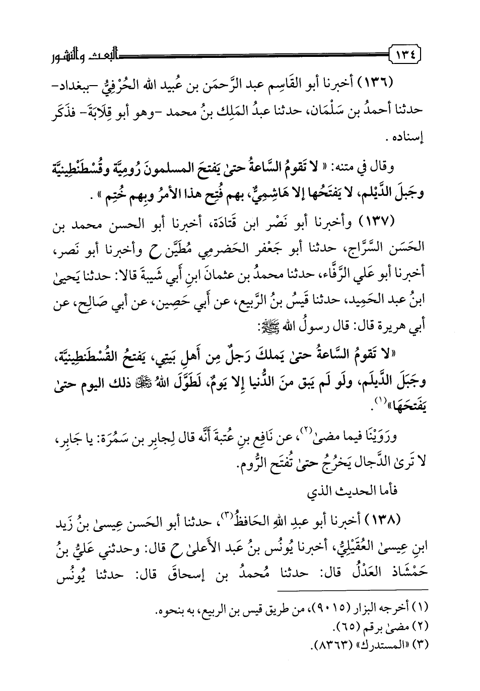 136 - أخبرنا أبو القاسم عبد الرحمن بن عبيد الله الحرفي -ببغداد- حدثنا أحمد بن سلمان، حدثنا عبد الملك بن محمد- وهو أبو قلابة- فذكر إسناده. وقال في متنه: "لا تقوم الساعة حتى يفتح المسلمون رومية وقسطنطينية وجبل الديلم، لا يفتحها إلا هاشمي، بهم فتح هذا الأمر وبهم ختم".
