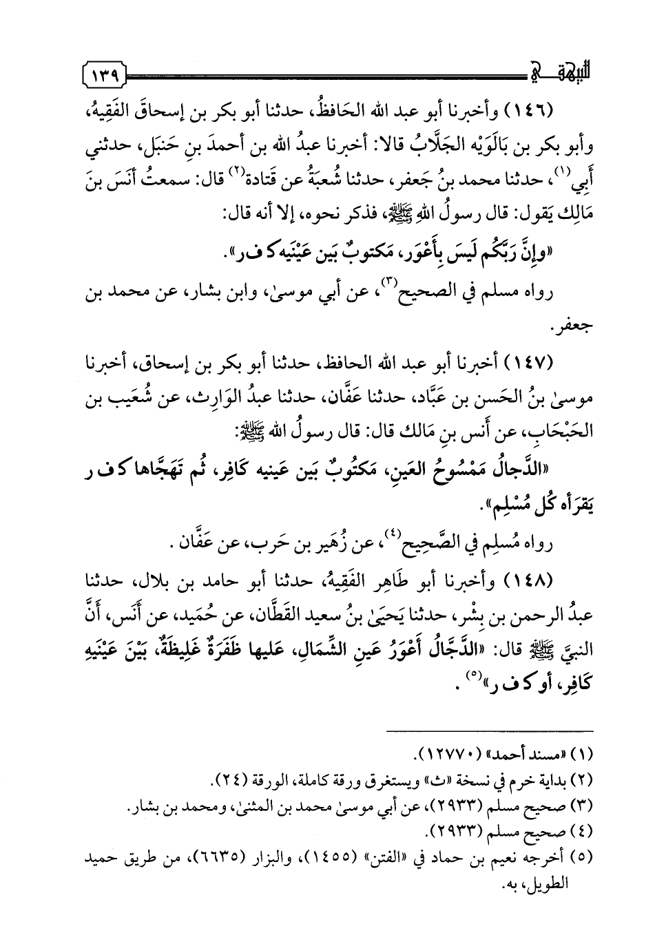 148 - وأخبرنا أبو طاهر الفقيه، حدثنا أبو حامد بن بلال، حدثنا عبد الرحمن بن بشر، حدثنا يحيى بن سعيد القطان، عن حميد، عن أنس، أن النبي صلى الله عليه وسلم قال: "الدجال أعور عين الشمال، عليها ظفرة غليظة، بين عينيه كافر، أو كـ ف ر".