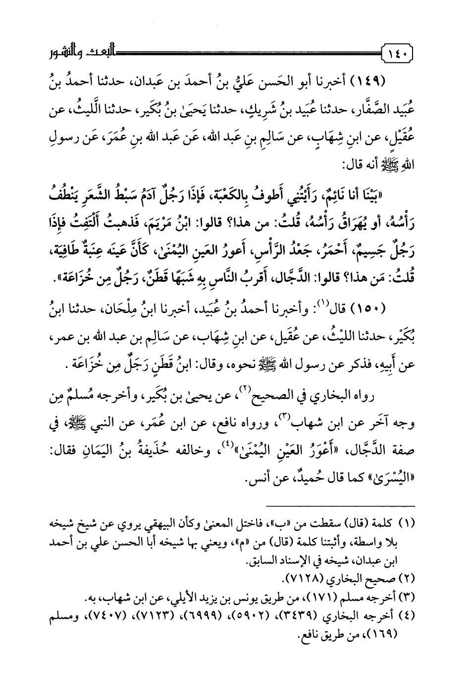 149 - أخبرنا أبو الحسن علي بن أحمد بن عبدان، حدثنا أحمد بن عبيد الصفار، حدثنا عبيد بن شريك، حدثنا يحيى بن بكير، حدثنا الليث، عن عقيل، عن ابن شهاب، عن سالم بن عبد الله، عن عبد الله بن عمر، عن رسول الله صلى الله عليه وسلم أنه قال: "بينا أنا نائم رأيتني أطوف بالكعبة، فإذا رجل آدم سبط الشعر ينطف رأسه، أو يهراق رأسه، قلت: من هذا؟ قالوا: ابن مريم، فذهبت ألتفت فإذا رجل جسيم، أحمر، جعد الرأس، أعور العين اليمنى، كأن عينه عنبة طافية، قلت: من هذا؟ قالوا: الدجال، أقرب الناس به شبها قطن، رجل من خزاعة".