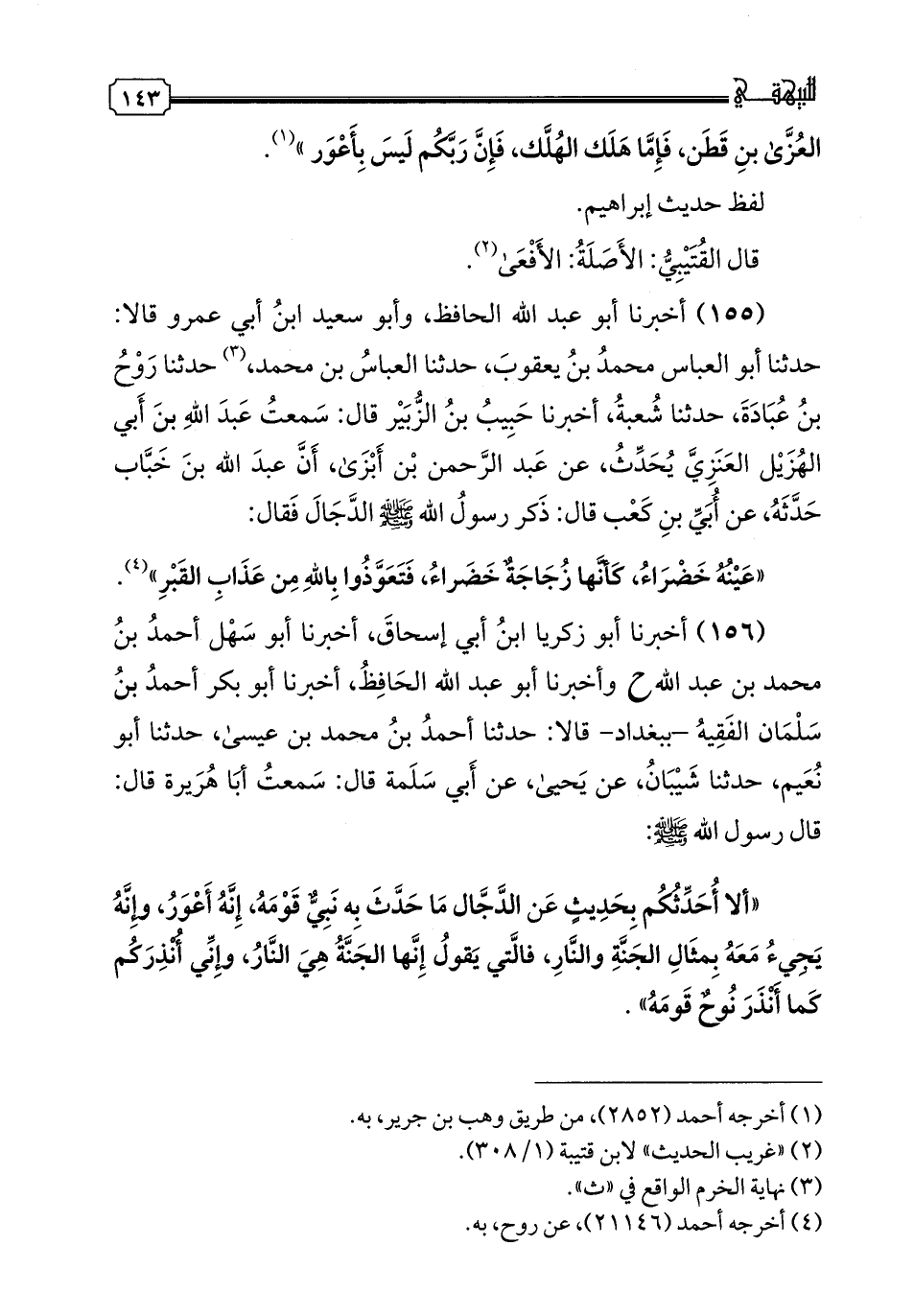 155 - أخبرنا أبو عبد الله الحافظ، وأبو سعيد بن أبي عمرو قالا: حدثنا أبو العباس محمد بن يعقوب، حدثنا العباس بن محمد، حدثنا روح بن عبادة، حدثنا شعبة، أخبرنا حبيب بن الزبير قال: سمعت عبد الله بن أبي الهزيل العنزي يحدث، عن عبد الرحمن بن أبزى، أن عبد الله بن خباب حدثه، عن أبي بن كعب قال: ذكر رسول الله صلى الله عليه وسلم الدجال فقال: "عينه خضراء كأنها زجاجة خضراء، فتعوذوا بالله من عذاب القبر".