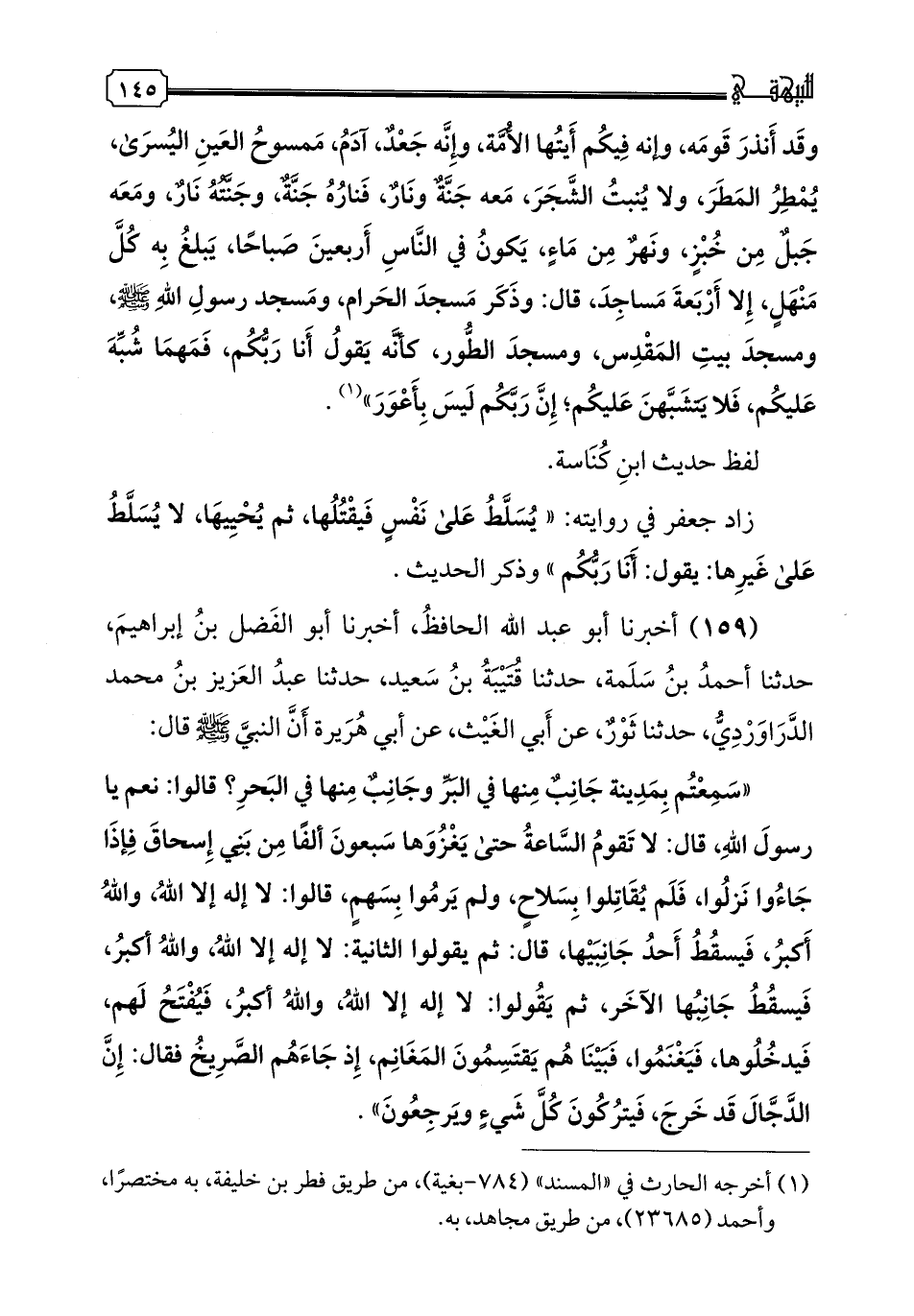 159 - أخبرنا أبو عبد الله الحافظ، أخبرنا أبو الفضل بن إبراهيم، حدثنا أحمد بن سلمة، حدثنا قتيبة بن سعيد، حدثنا عبد العزيز بن محمد الدراوردي، حدثنا ثور، عن أبي الغيث، عن أبي هريرة أن النبي صلى الله عليه وسلم قال: "سمعتم بمدينة جانب منها في البر وجانب منها في البحر؟ قالوا: نعم يا رسول الله، قال: لا تقوم الساعة حتى يغزوها سبعون ألفا من بني إسحاق فإذا جاءوا نزلوا، فلم يقاتلوا بسلاح، ولم يرموا بسهم، قالوا: لا إله إلا الله، والله أكبر، فيسقط أحد جانبيها، قال: ثم يقولوا الثانية: لا إله إلا الله، والله أكبر، فيسقط جانبها الآخر، ثم يقولوا: لا إله إلا الله، والله أكبر، فيفتح لهم، فيدخلوها، فيغنموا، فبينا هم يقتسمون المغانم، إذ جاءهم الصريخ فقال: إن الدجال قد خرج، فيتركون كل شيء ويرجعون". أخرجه مسلم في الصحيح، عن قتيبة.